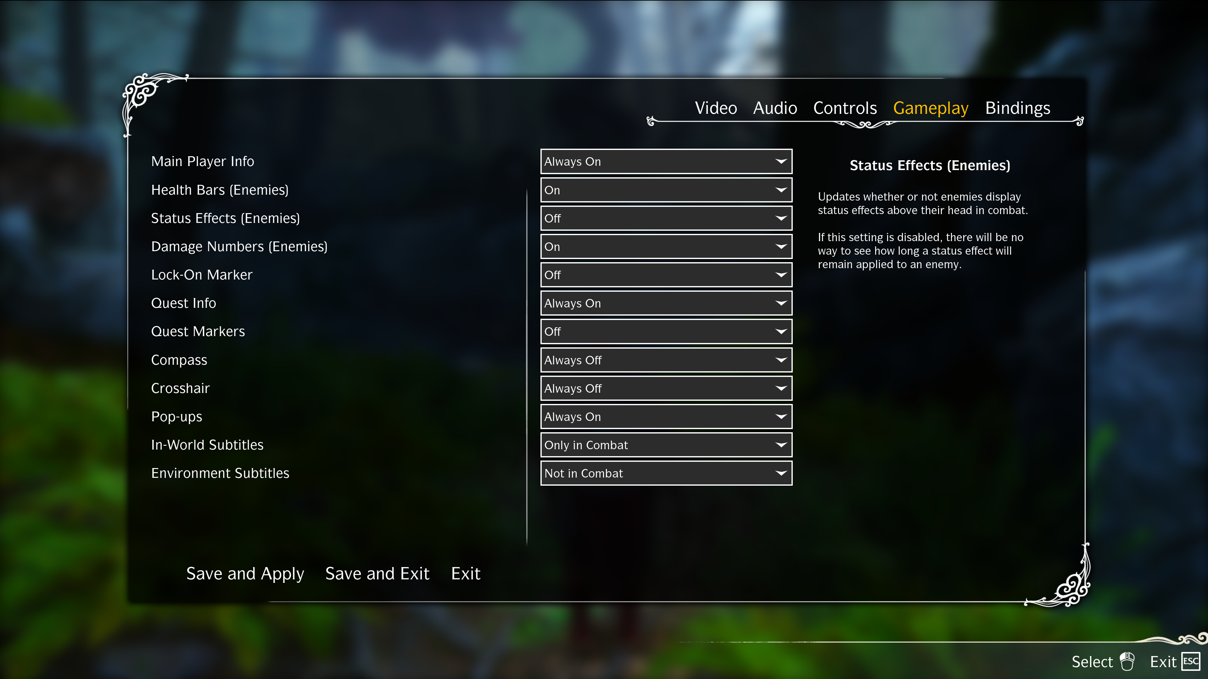 The gameplay tab is where you can toggle on and off all of your individual HUD elements, depending on how you like to play. Most of these elements can be set to either enabled or disabled entirely, or enabled only in combat.