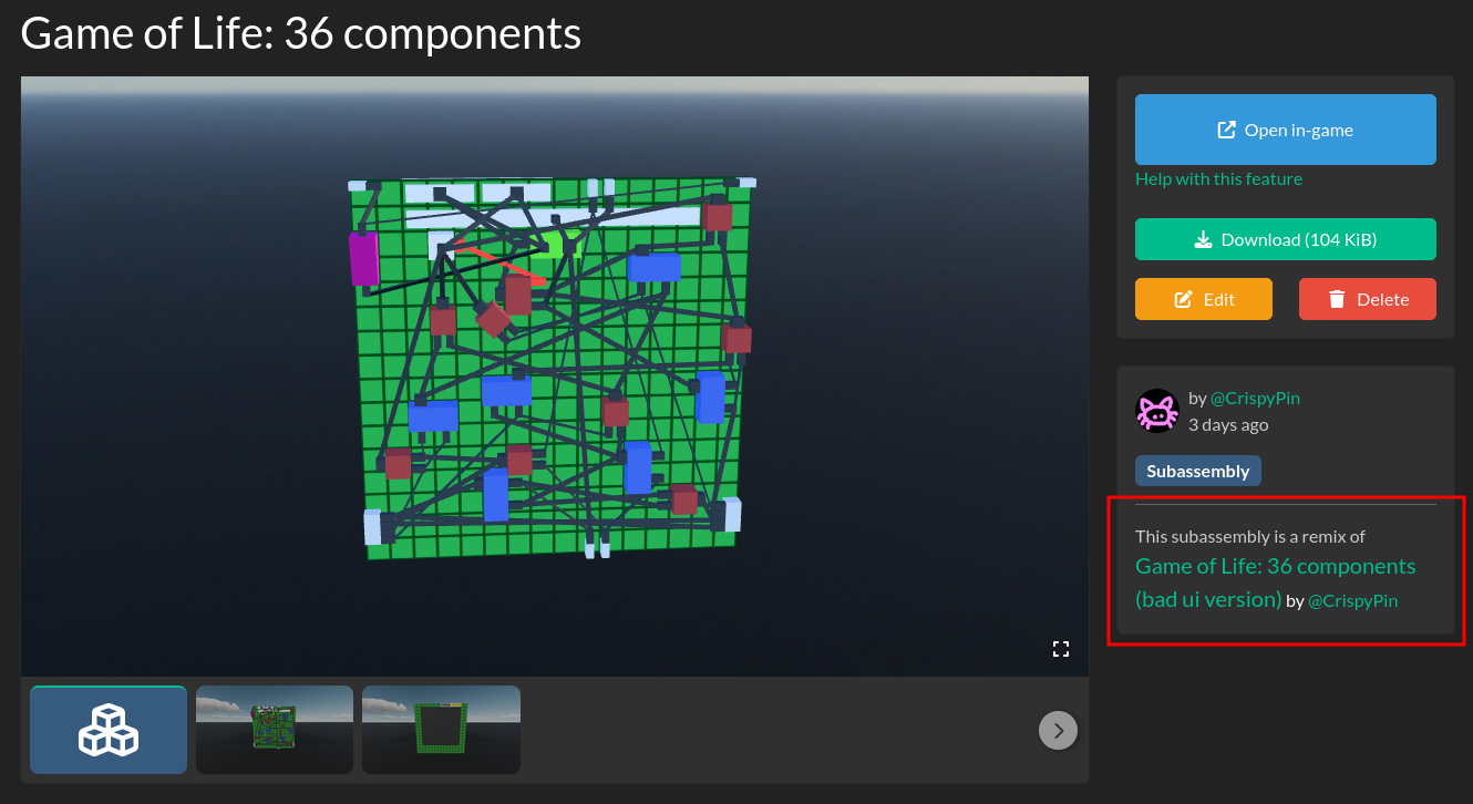 A few days ago I was browsing the Logic World Discord server and noticed a few people iterating on the design of a circuit, sharing each attempt as a subassembly on the Hub. When I opened each one to see the implementation, I realized that it would be great if you could properly link two creations and say "this one is based on that one" without having to manually write this in the description and add a link.