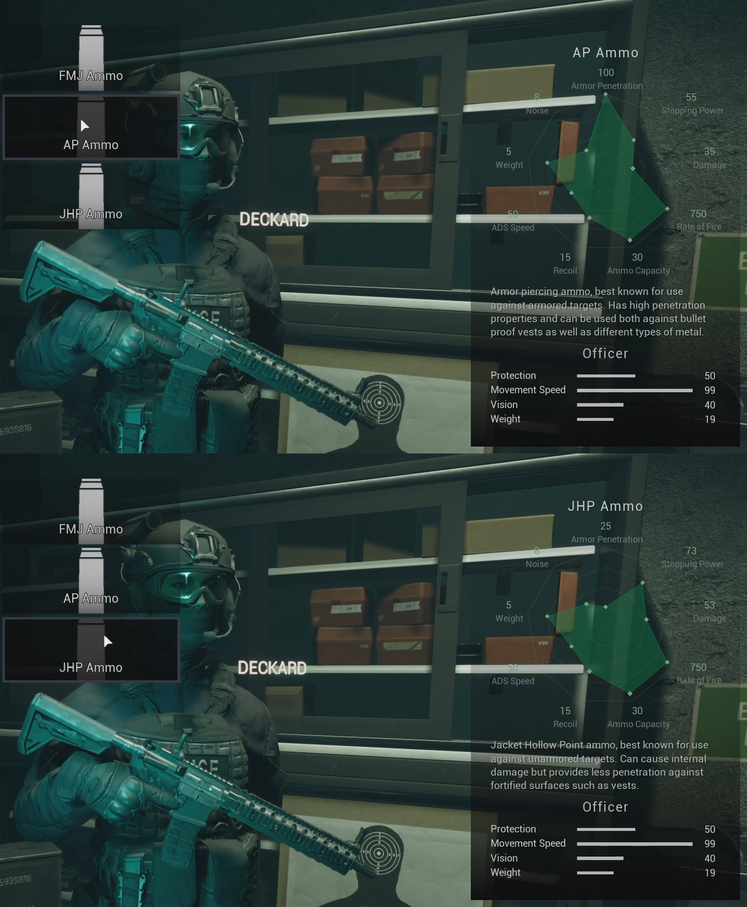 It's important to note that you can, for all your weapons, replace the JHP ammo with the amor-piercing (AP) and jacketed hollow point (JHP) rounds. Why? Because, as you can see from the stats in fig. 2, they affect your weapon's capabilities significantly.