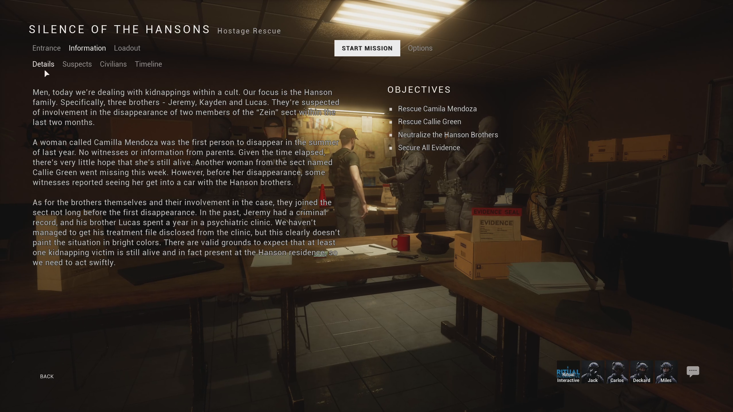 By studying the mission's briefing of course! The briefing considers a text description of the mission on which you're about to deploy, the timeline of events, and the dossiers of suspects you will encounter in your effort to complete its objectives.