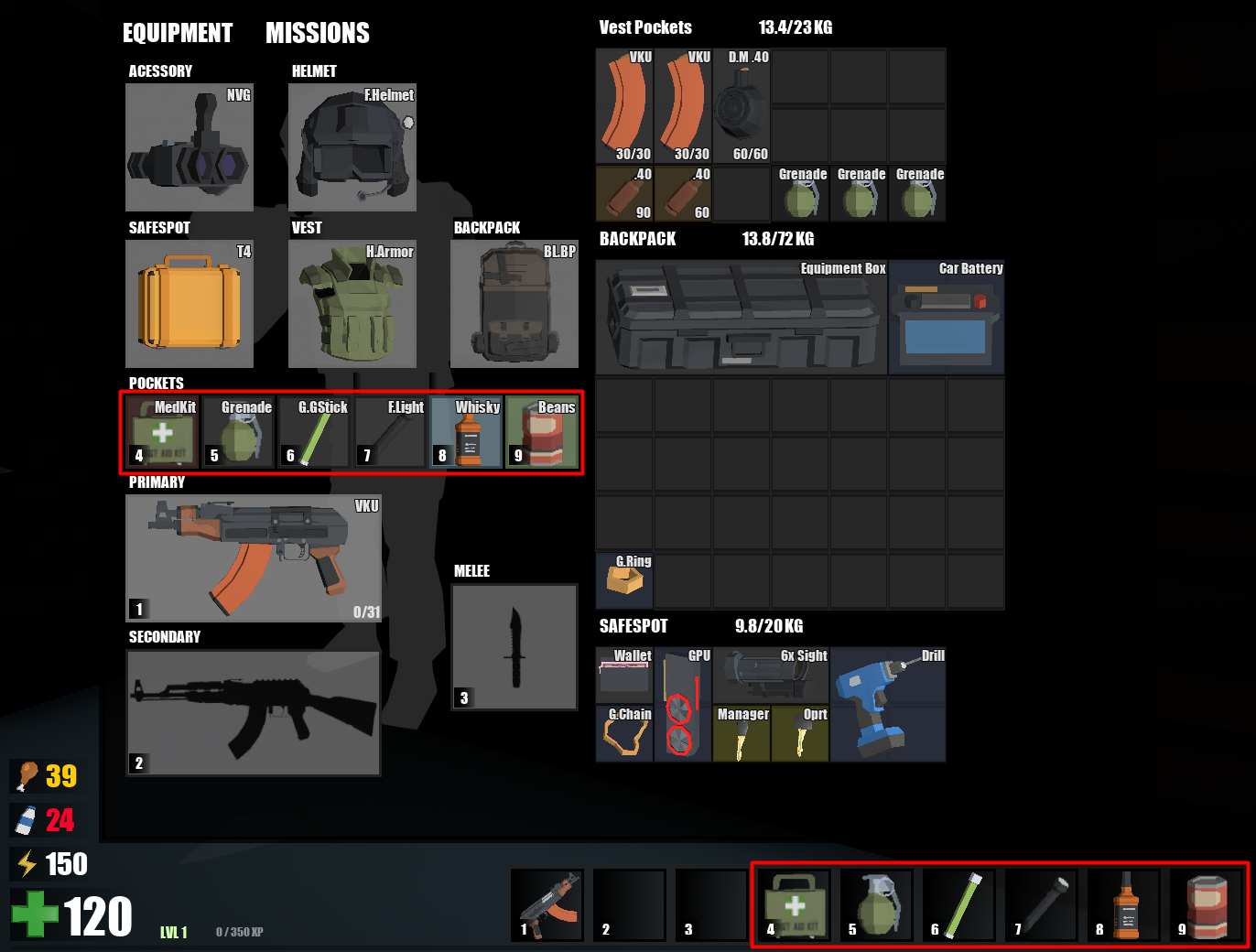 Added 6 new pocket slots on the Character Equipment that can store foods, drinks, meds, throwables and holdables. Every pocket slot is bound to a Quick Slot Bind, so moving one of these items directly to the pocket slot will bind automatically the item, the same goes for quick equipping the item.