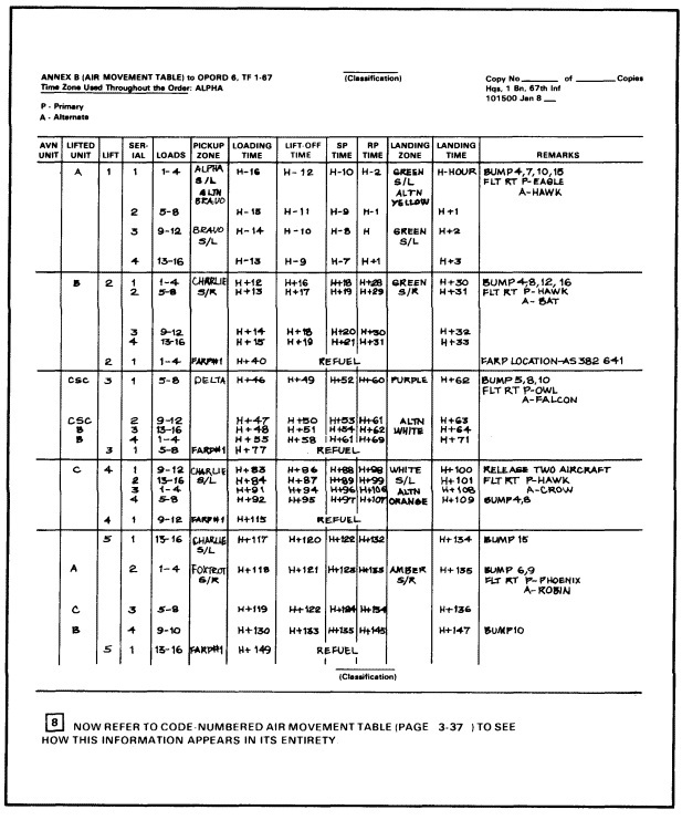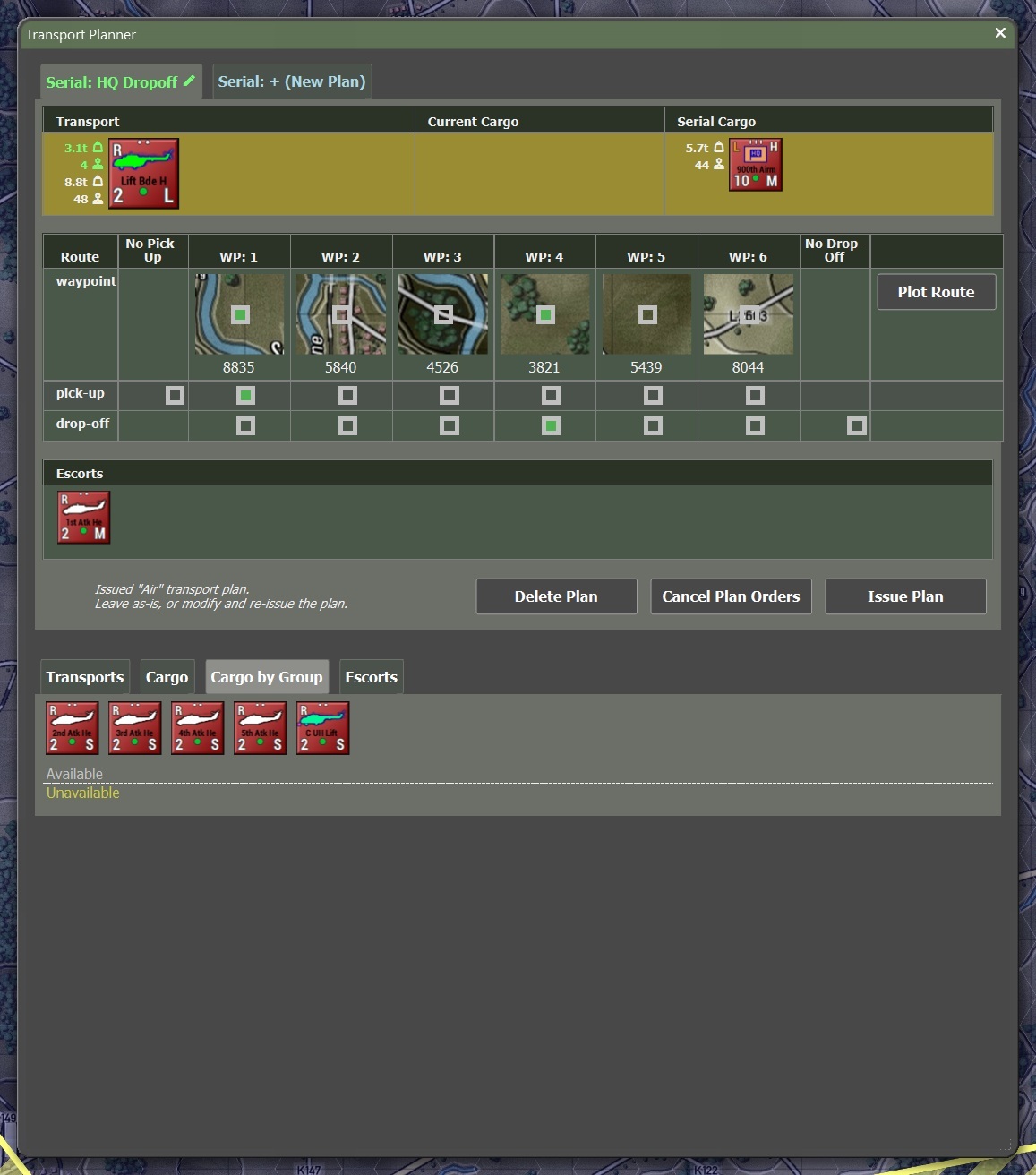 This is a pretty simple plan as all things go, but it serves as a good example for looking at the various elements at your fingertips. The top section is pretty similar to the Air Movement Table above, showing us which transport unit is carrying which passengers. Below that we can see the path the transport will take, where it’s going to pick up the passengers and where it will drop them off. I have utilized the ability to set six waypoints to have the transport helicopter do some exfil as well. In the next section we can see which units have been attached as escort duty to this plan. Issuing this plan will give the respective orders to all of our units involved.