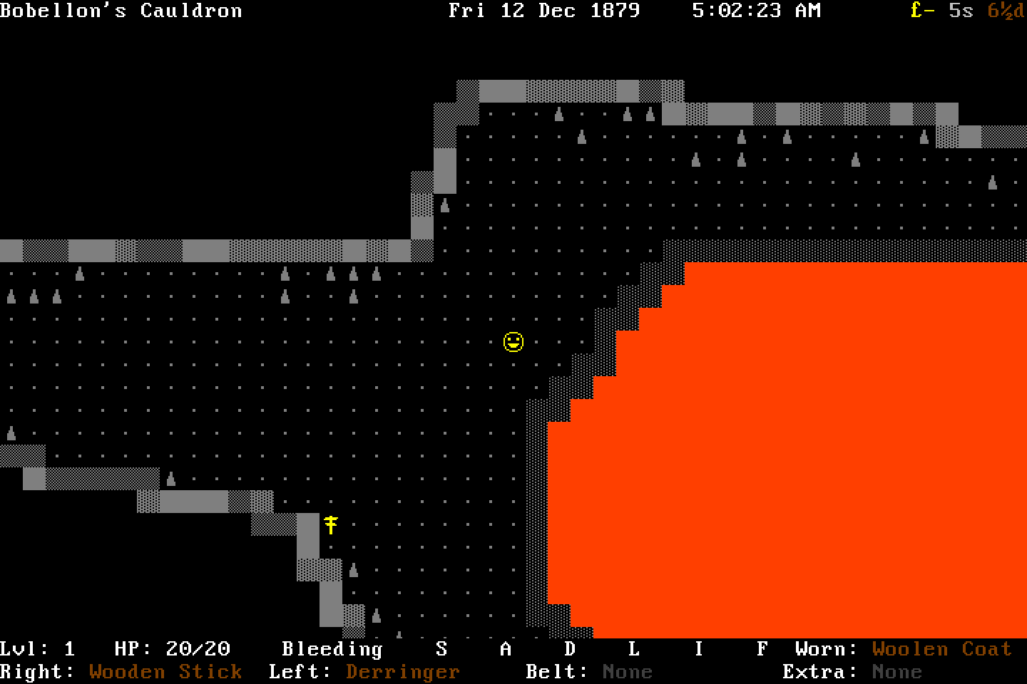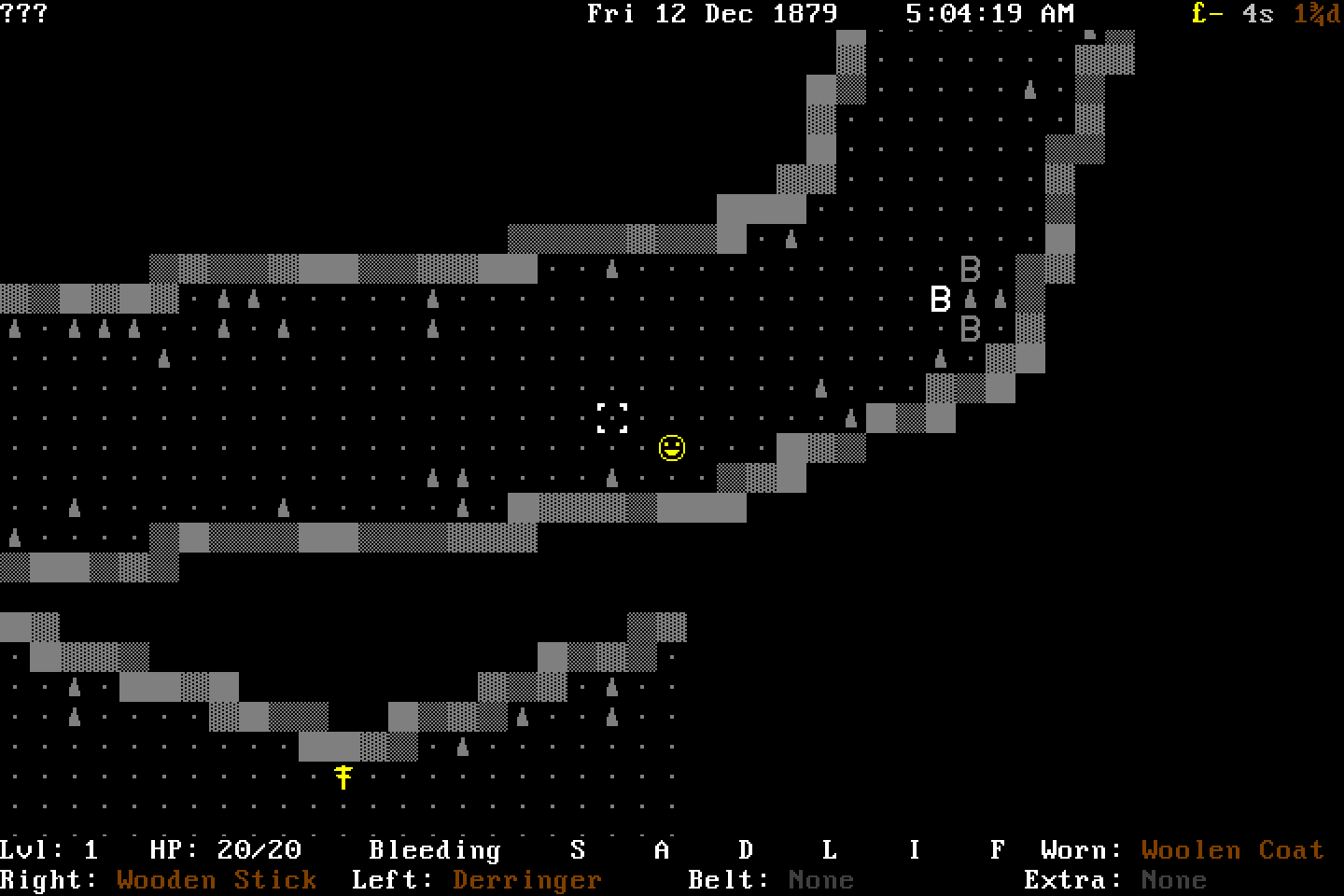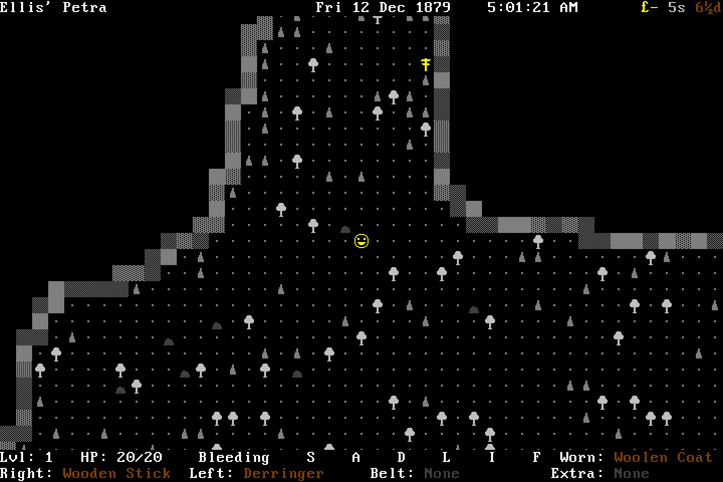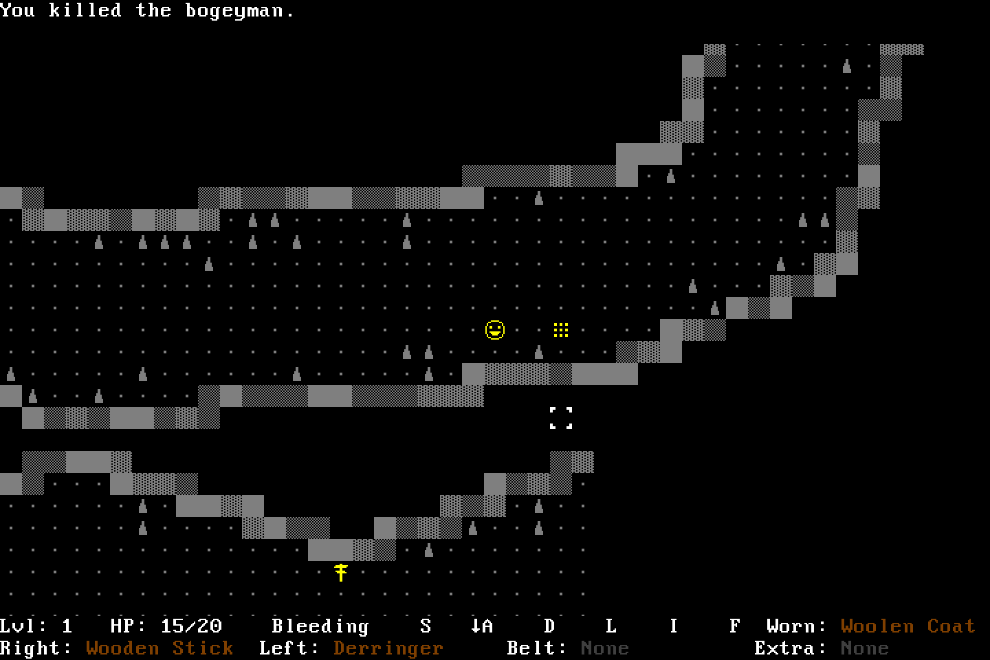 Mobs also have a few drops now: coins, ammo, and tonics. My initial idea for ammo is to have a "fair" ammo drop, where monsters only drop ammunition you can use. In theory, you can "farm" ammunition of a certain type by dropping your weapons in town and killing monsters, but I have my doubts about how practical this would be (as opposed to just doing things). I will have to play around with balance a bit. Perhaps the derringer, as pathetic as it is, is too overpowered with its two shots, and I'll replace it with the pipe pistol. 20 might be too much ammo now, and I also might need to raise ammo prices. But we will see about that.