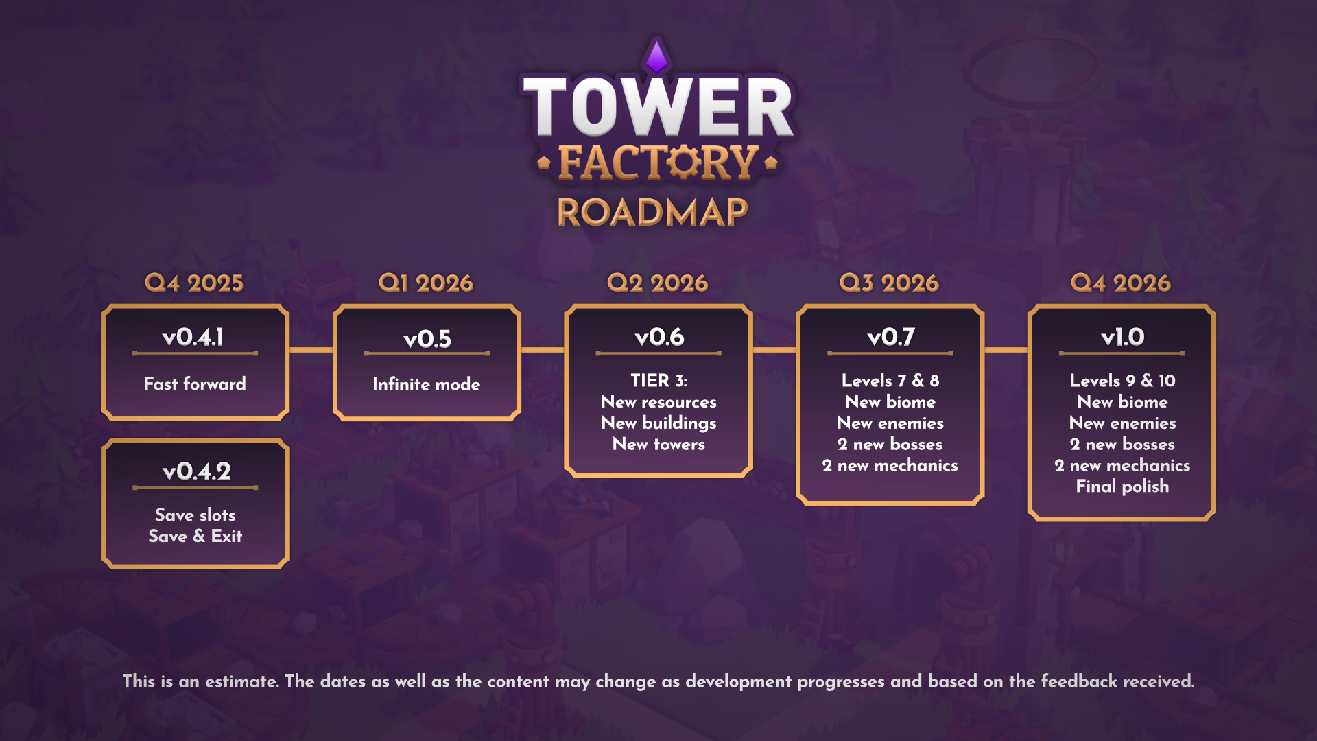 At the end of November 2024 I published a roadmap with estimated dates and updates. Those of you who saw it will have noticed that, as often happens, the dates have slipped. That’s why today I want to share an updated roadmap, with more realistic dates and a clearer plan for the remaining content leading up to Tower Factory 1.0.
