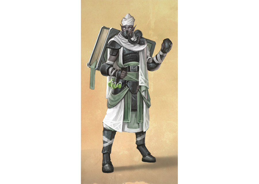 With Steelgate destroyed, Silence has adopted a nomadic life in the deserts and barren lands of Terrene Gall, where they can more easily commune with the dead. Before departing, they salvaged all the knowledge they could; carrying more than seems comfortable: packs heavy with books and scrolls, water bottles, and the occasional vial of life-ending poison.