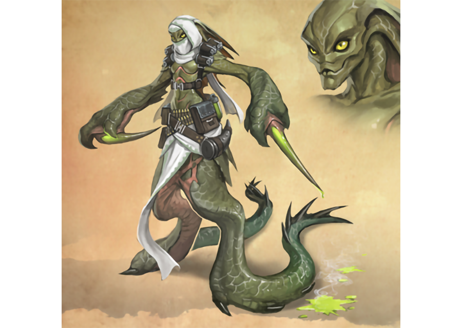 The August kin, servants to the Elven members of Silence, are humanoid in shape but have pronounced lizard features (head shape, skin, tails, claws, etc.). They wear little to no clothing, relying instead on belts and harnesses that help them carry their weapons and equipment.