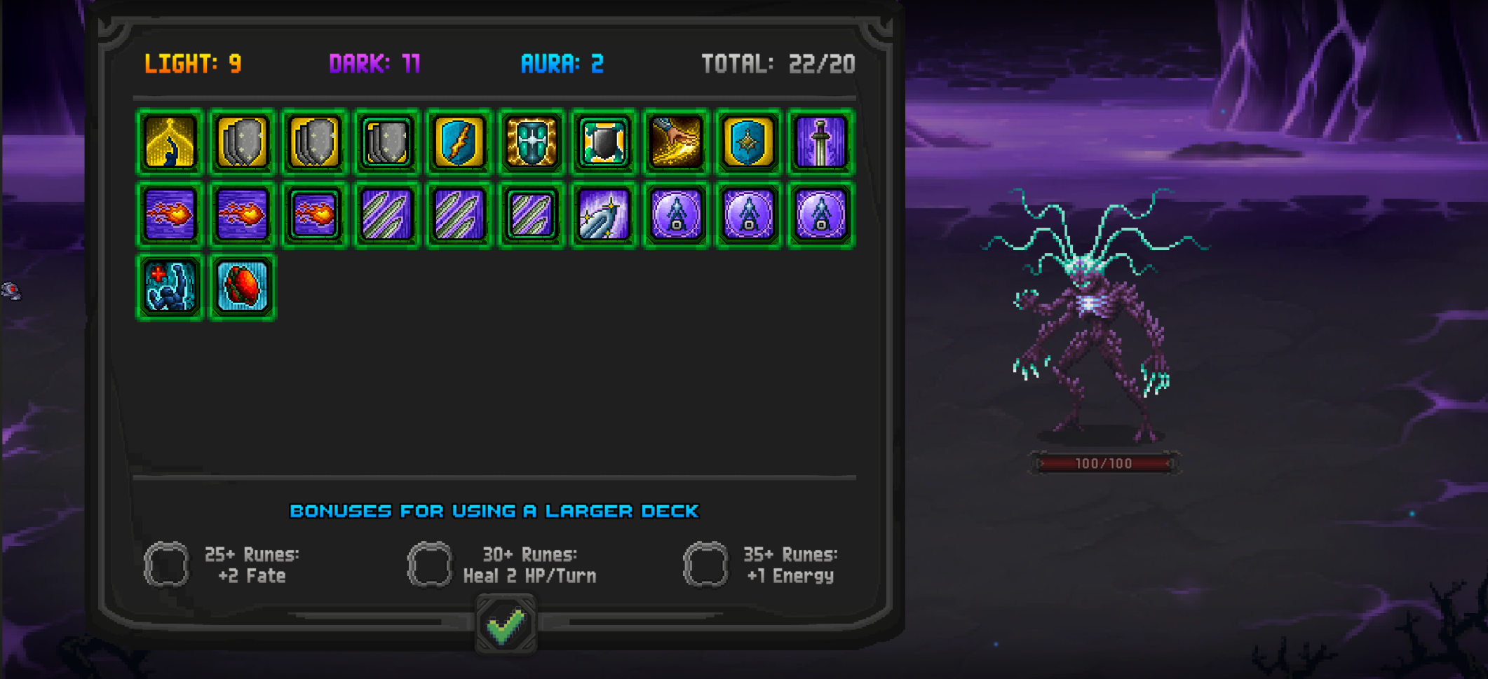Added a Deployment Phase: choose which runes to bring into battle. Minimum deck size is 20. Smaller decks support match-focused builds, while larger decks grant combat bonuses. This now lets you add new runes to your deck without worrying you are diluting out your match potential.