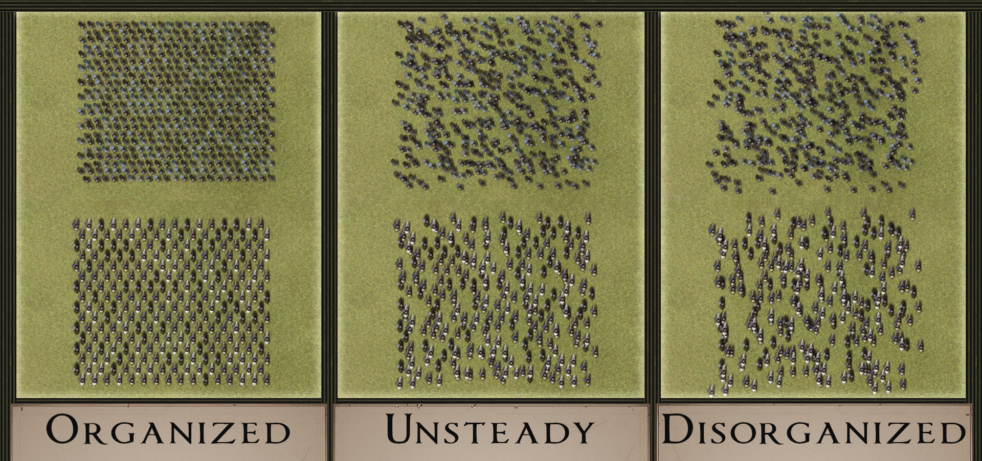 Each unit displays the exact number of troops it contains: infantry with 484, cavalry with 256, and foot skirmishers with 361. In this view you can also notice the effect of the "organization" stat, which represents how well the soldiers inside a unit are arranged and disciplined.