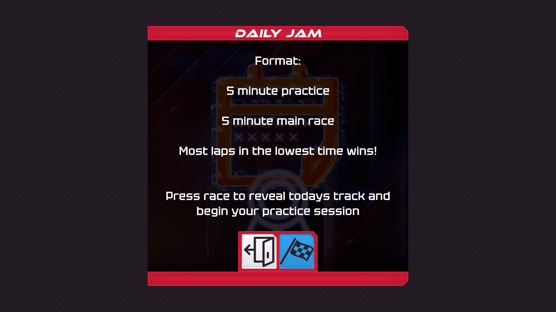 -Everyone has one shot each day to win, with a 5 minute practice session and a 5 minute main race
