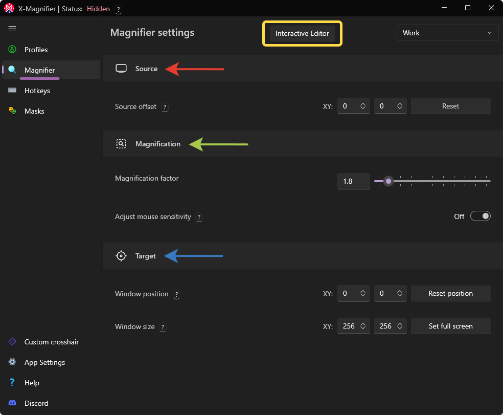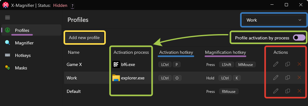 X-Magnifier now features a menu for managing profiles that help you switch between tasks quickly. For each profile, you can set: