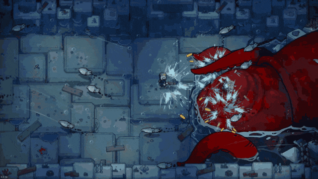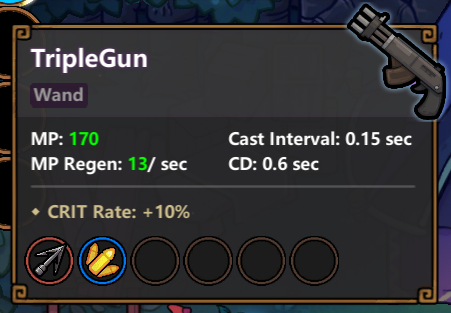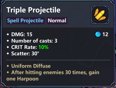 Triple Projectile: Fires three evenly spread bullets. Hitting enemies 30 times will charge up one Fishing Harpoon.