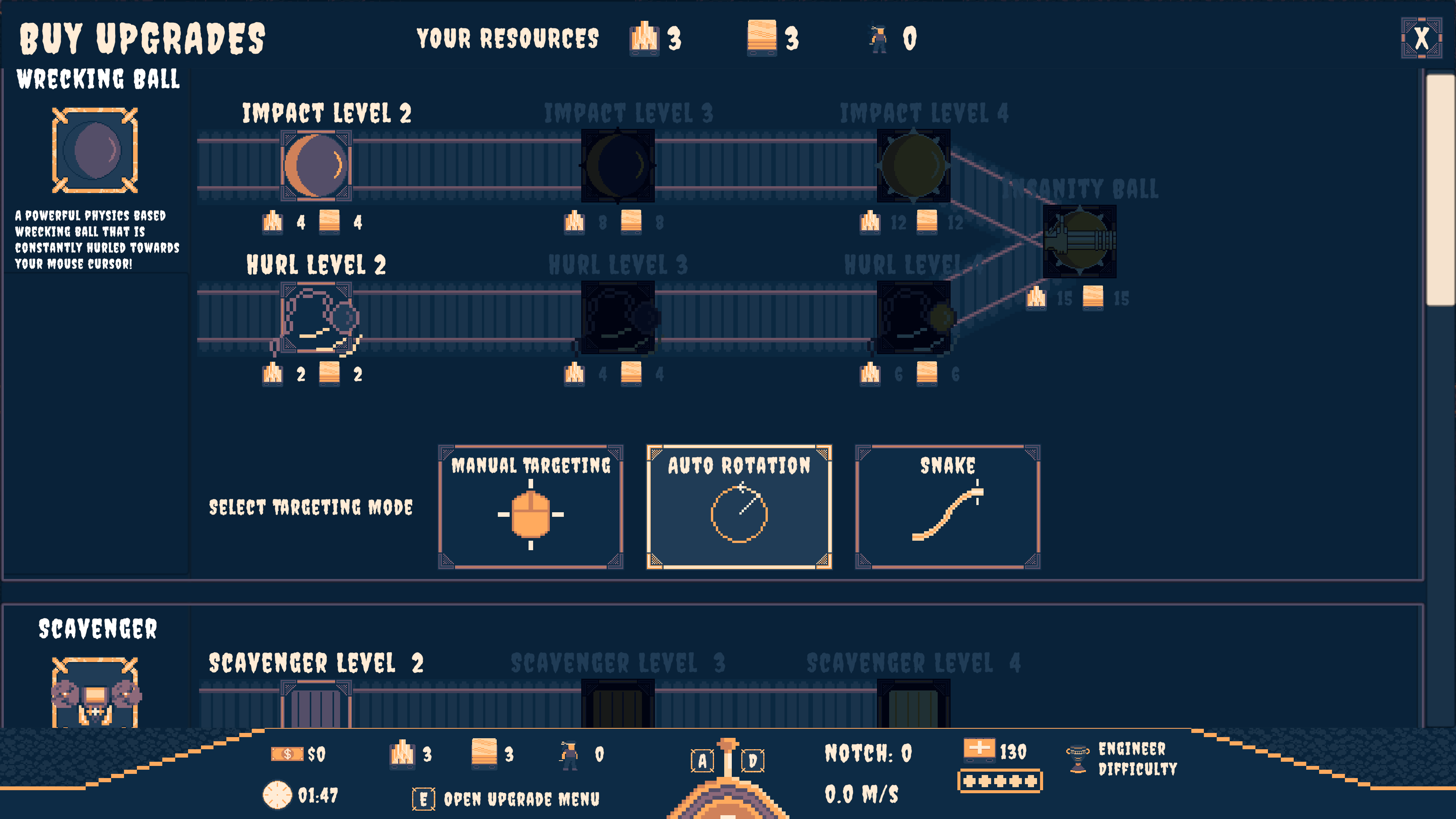 Note: For the wrecking ball you must have at least the first Hurl Level purchased or else the auto rotation will not be able to kick in. There just isn't enough oomph until you upgrade the Hurl Level.