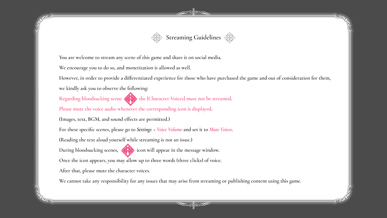 You may stream the entire demo. However, for certain scenes, we kindly ask you to mute the character voices in order to preserve a unique experience for those who will play the full version.