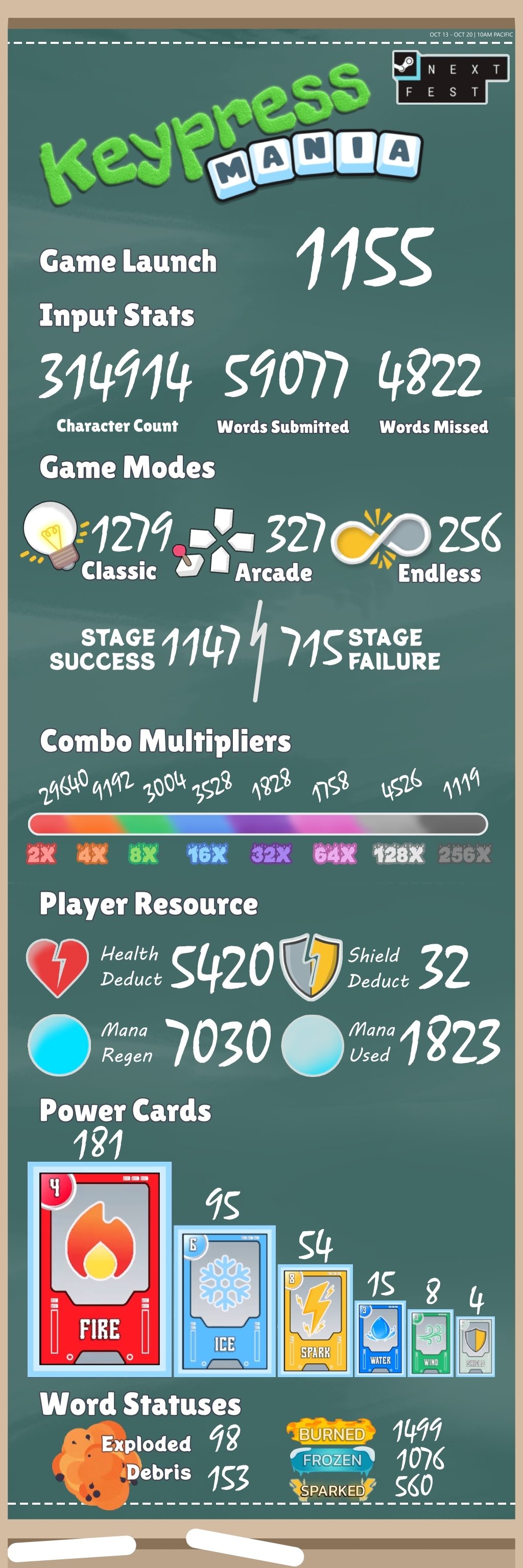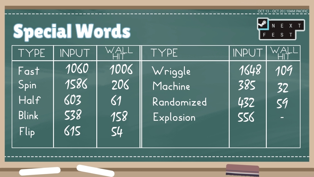 Before the next fest start, I lowered the difficulty of the Classic Mode to cater newbies but the ratio of failure rate is still high. I will try to further experiment on the difficulty curve for the full game so that players new to the typing game genre can progress step-by-step.