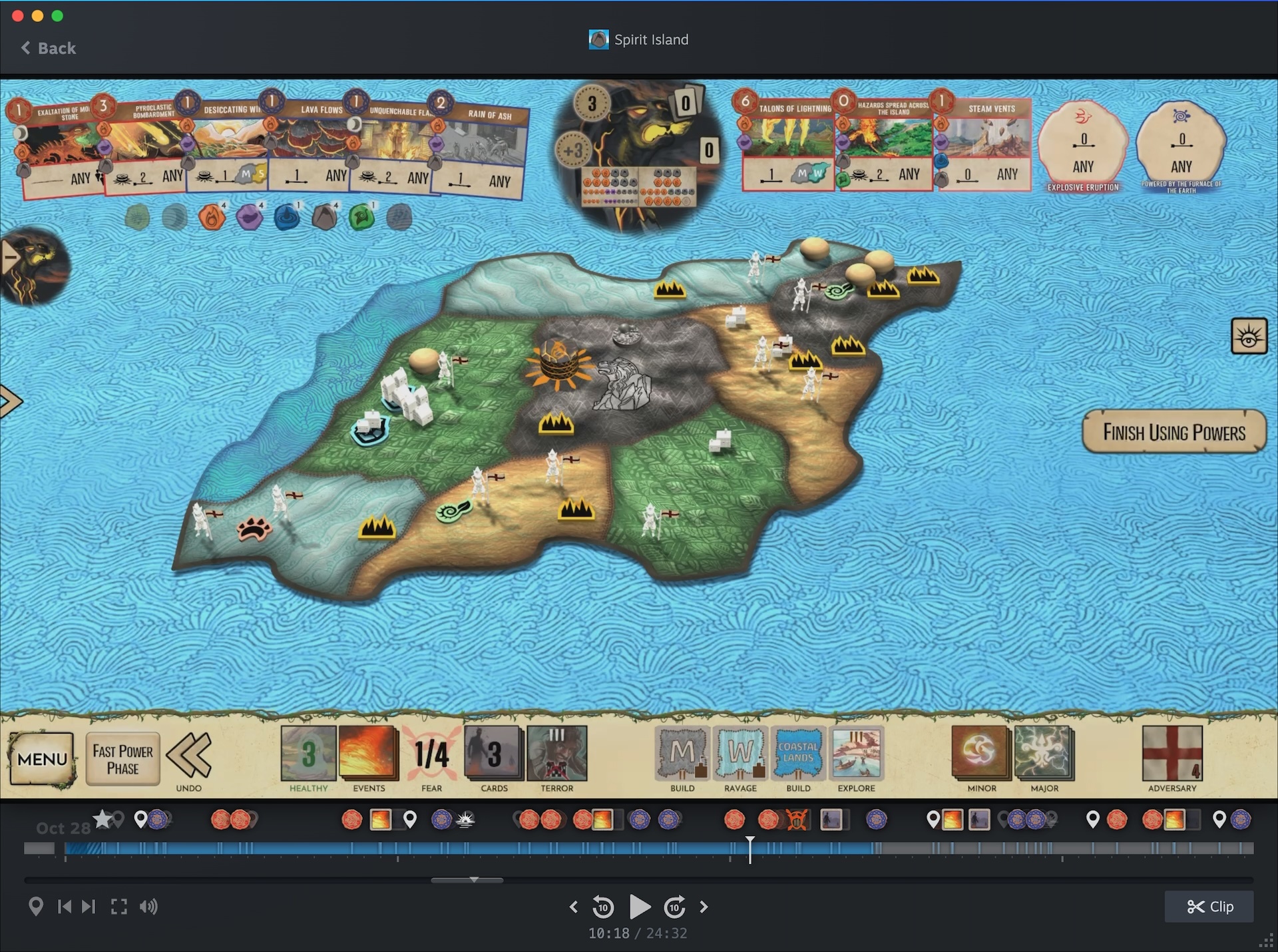 The Steam Game Recording feature is available in the beta version of the Steam Client. Record your gameplay automatically in the background, view replays, and share clips. Spirit Island generates event markers as relevant game events happen.