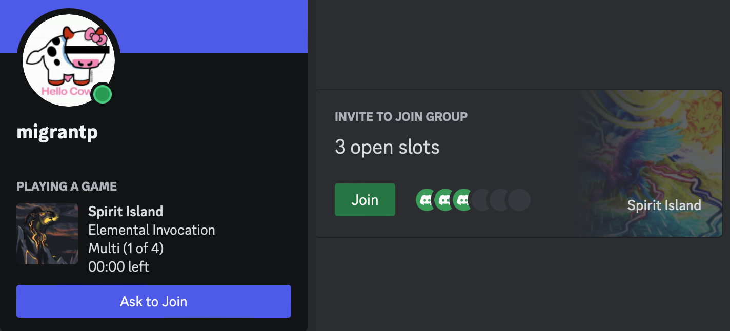 When you're playing the game and Discord is open, it will show details about your game in progress. You can invite people to your multiplayer game using the "+" button in Discord, or right click on a friend to ask to join their game. You can find players on our official Handelabra Discord Server! Read more about the feature on Discord's site.