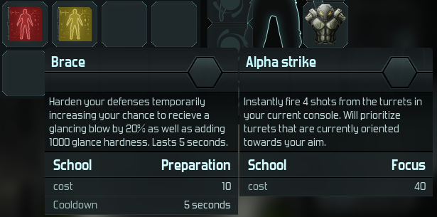 Red skills have a defensive emphasis. Yellow skills have a damage dealing emphasis. Blue skills have an emphasis on support and battlefield control. They can be activated only from the navigation console, and when you have them equipped you will see a new energy resource bar while piloting your ship.