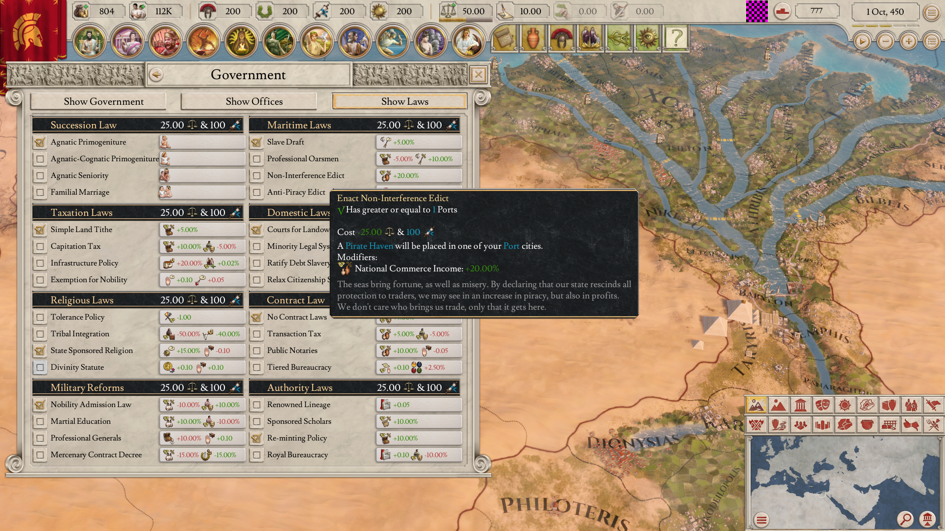 In Imperator: Rome Pirates spawn and block ports indefinitely, this is a nuisance for the strong, and very disruptive to those who are weak with no navy as they block their ability to “break free” from their home ports. Apart from laws blocking the creation of pirates from your own ports entirely, or permanently placing a fleet outside your ports there is little you can do to stop them. Meaning your options are to withstand constant penalties or turn them off completely. Neither is very engaging.