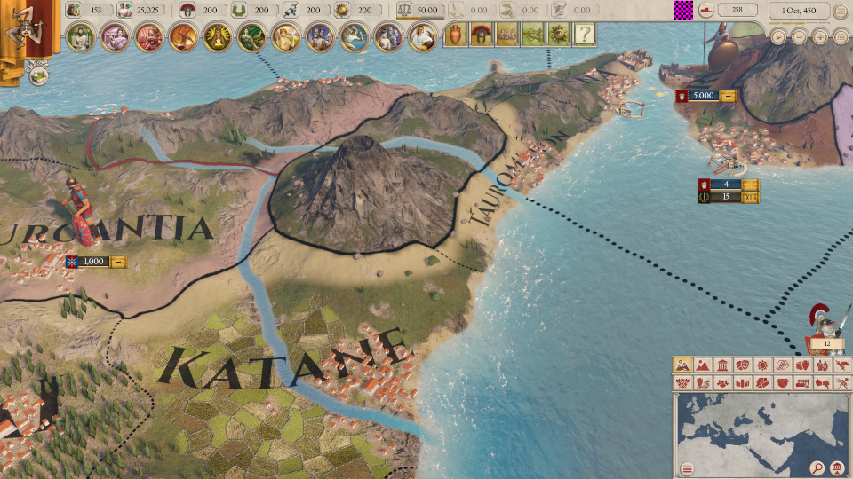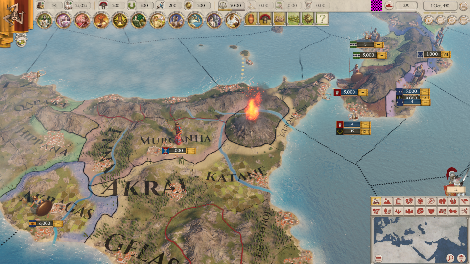 Volcanoes hold a very significant place in Roman history, as the eruption of Vesuvius has given us both a detailed snapshot of what a Roman city looked like just 100 years after our game ends, and the name for a Plinian eruption themselves after the man who left a description of it to the world. In the region covered by our game a large number of Volcanoes were active at the time, and many of them remain active to this day. Just outside the era we cover Volcanic eruptions greatly influenced the course of history, with Mount Aetna even stopping a Carthaginian invasion 100 years prior.
