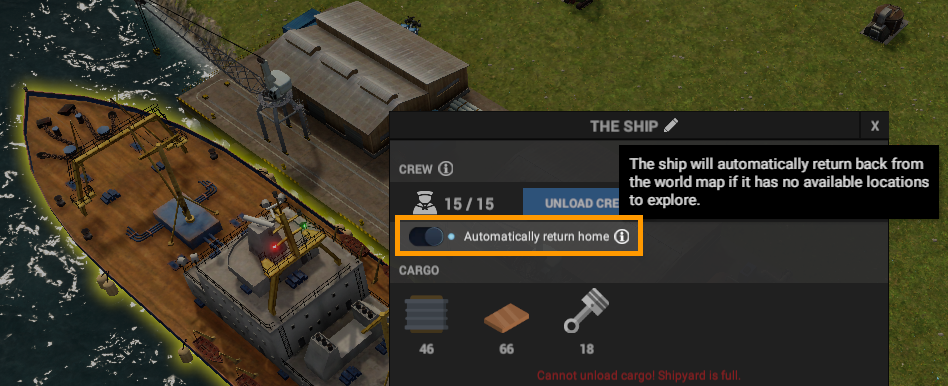 It is often the case that once the main ship has no more fuel for exploration, the only reasonable action is to return home. But it has to be done manually. To avoid this micro-management we’ve added a new toggle (on, by default) that will send your ship back to the dock if it has no further options for exploration or movement on the map.