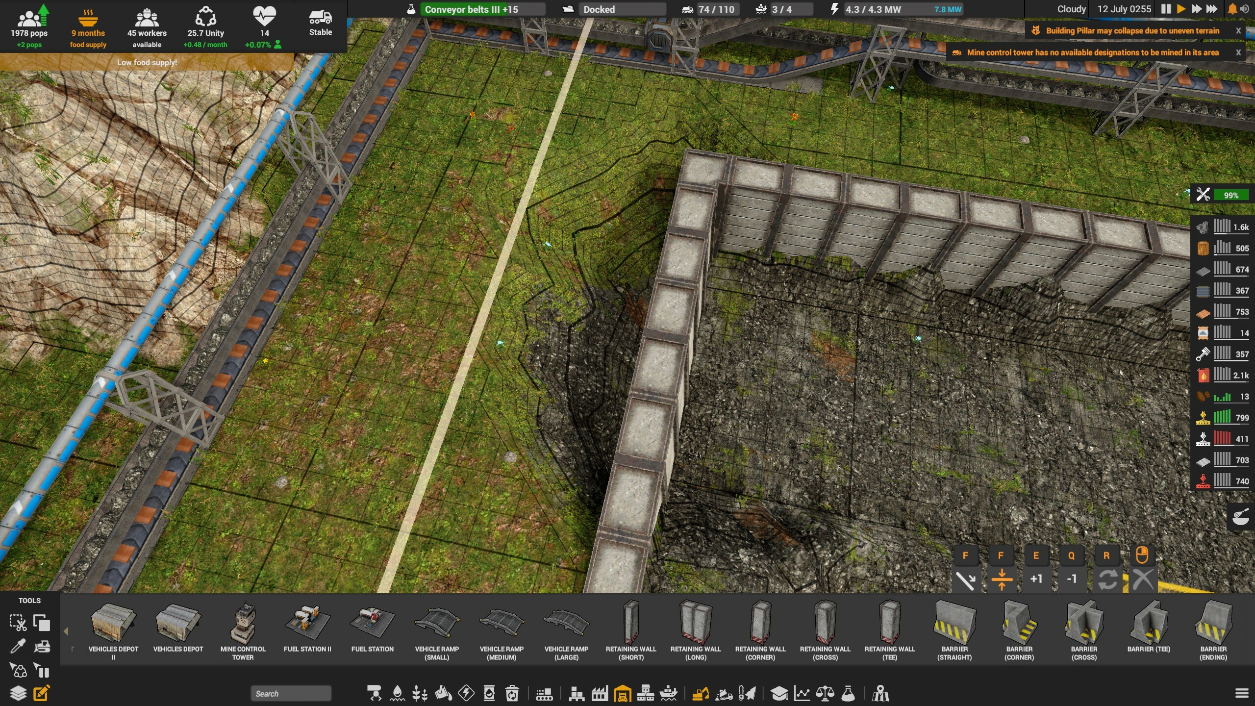 To prevent this from happening, mining/dumping designations now cannot be placed on tiles that contain retaining walls and vice-versa. This should help avoid excavators and trucks messing up your neatly placed mine walls! We’ve added a console command