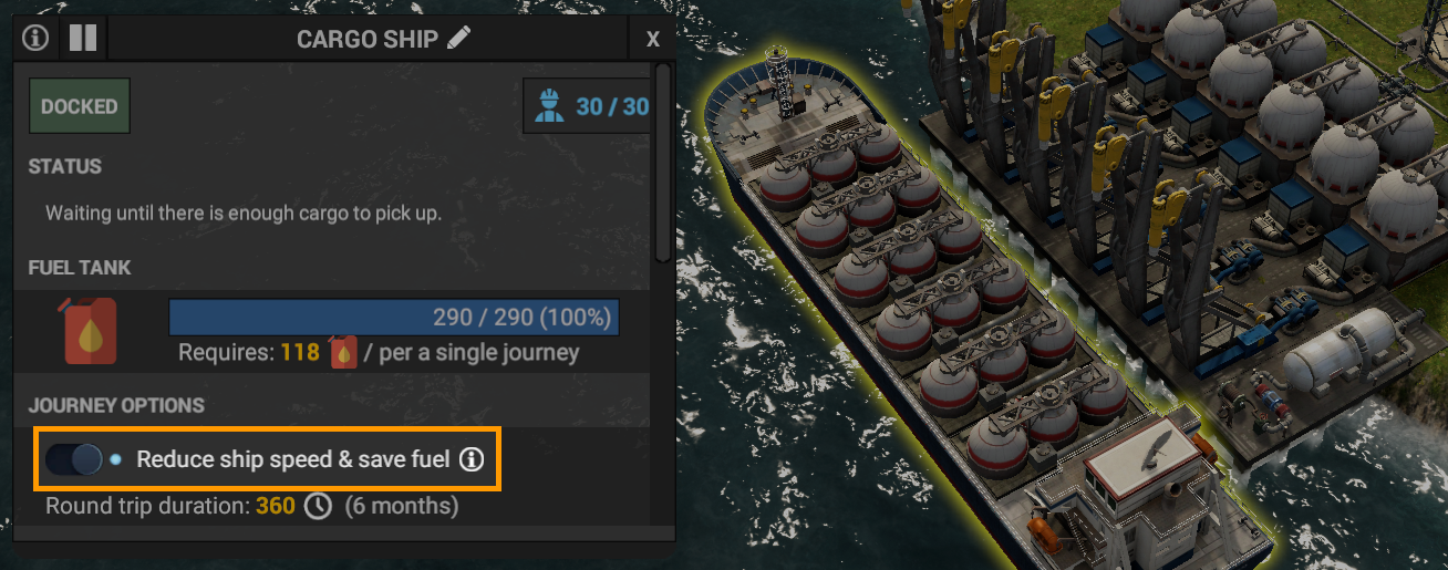 Sometimes, ships deliver cargo too fast and the ship is just waiting to unload in the dock. Turns out that in real life, if you are not in a hurry, slowing down can save a significant amount of fuel. This is why we have added a new toggle that reduces ship speed to 50% but also reduces fuel consumption by 30%. This is a great way to reduce diesel consumption for lower priority routes that do not require quicker delivery.