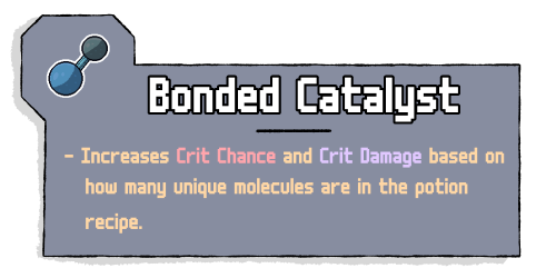 Bonded Catalyst focuses on those complex potions that use multiple molecules in their recipes. Your potion's Crit Chance and Crit Damage are increased based on how many molecules this potion uses that are different.