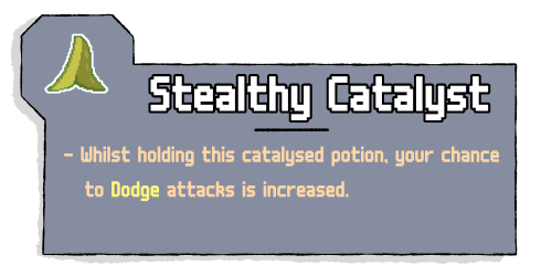 Stealthy Catalyst simply gives you an increased Dodge Chance when holding it. Dodge is a new stat that lets you avoid an instance of damage. Time your potion switches and this could be a lifesaver.