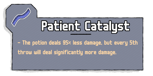 Patient Catalyst signficantly reduces your damage output, but on the 5th potion hit you'll get a massive strike that exceeds the power of all five normal hits.
