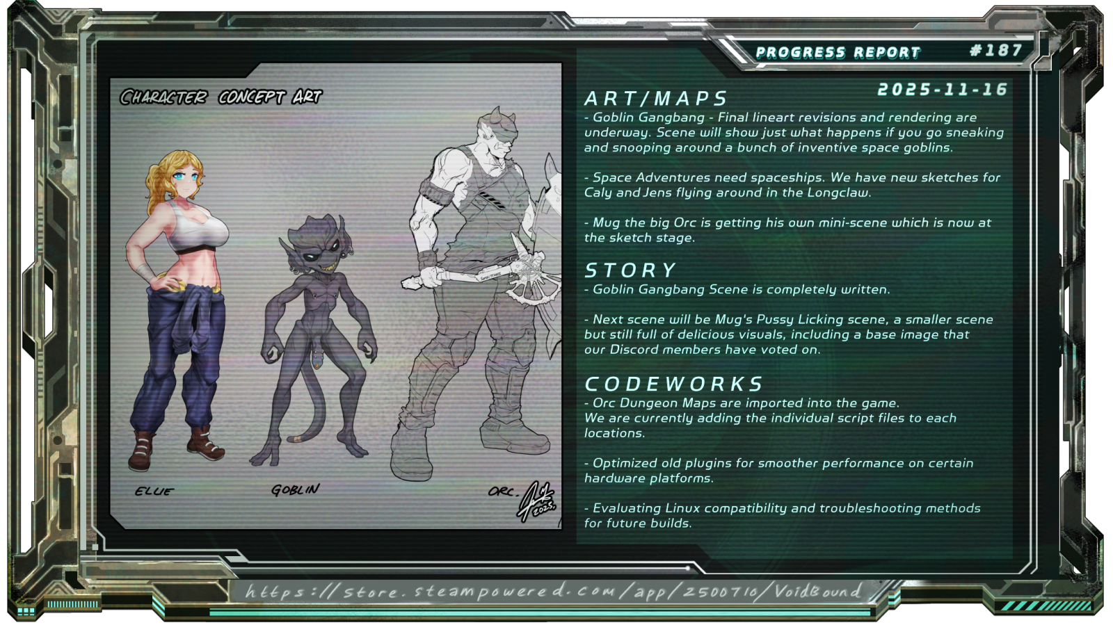 The full script for the Goblin Gangbang scene is locked in, pairing nicely with the art progress and ensuring it lands with all the intensity (and humor) goblin chaos deserves.