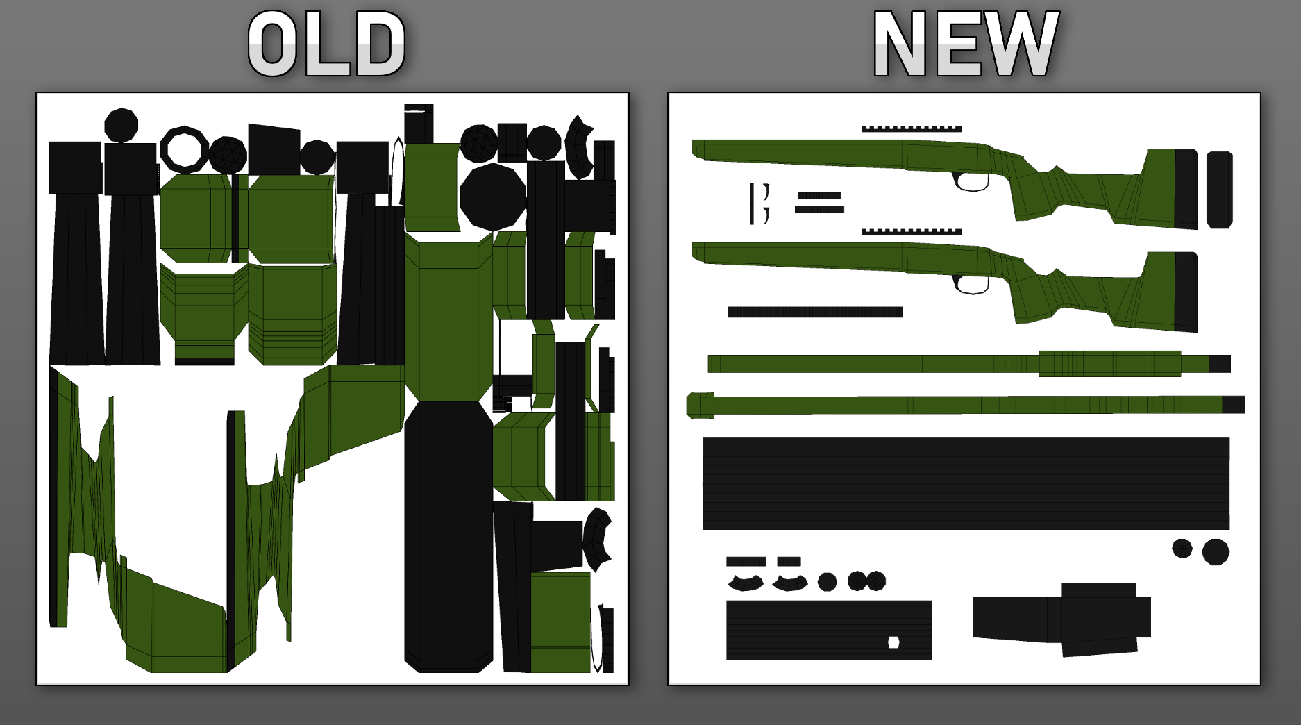I've redesigned the UV maps for the rifle, shotgun, sniper, weapon sights, and grapple hook. You can see all the UV maps on the new documentation website, but here's an example of the old vs new UV maps for the sniper: