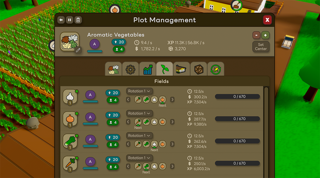 For example, if you've got a layout producing Aromatic Vegetables, you can consolidate the plots into one Management Group which displays production status and statistics for Aromatic Vegetables. The group's floating icon will then show the Aromatic Vegetables icon and it will color its ring to display the current production status of all the Packagers producing Aromatic Vegetables. Opening the panel for this group will also highlight the overall Aromatic Vegetable production rates and the value of those produced items.