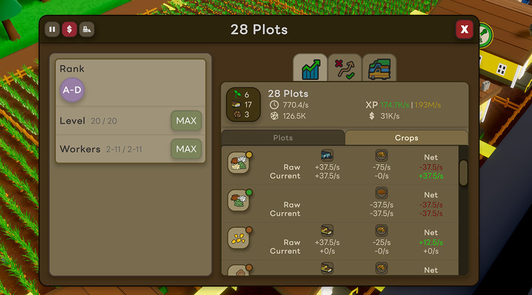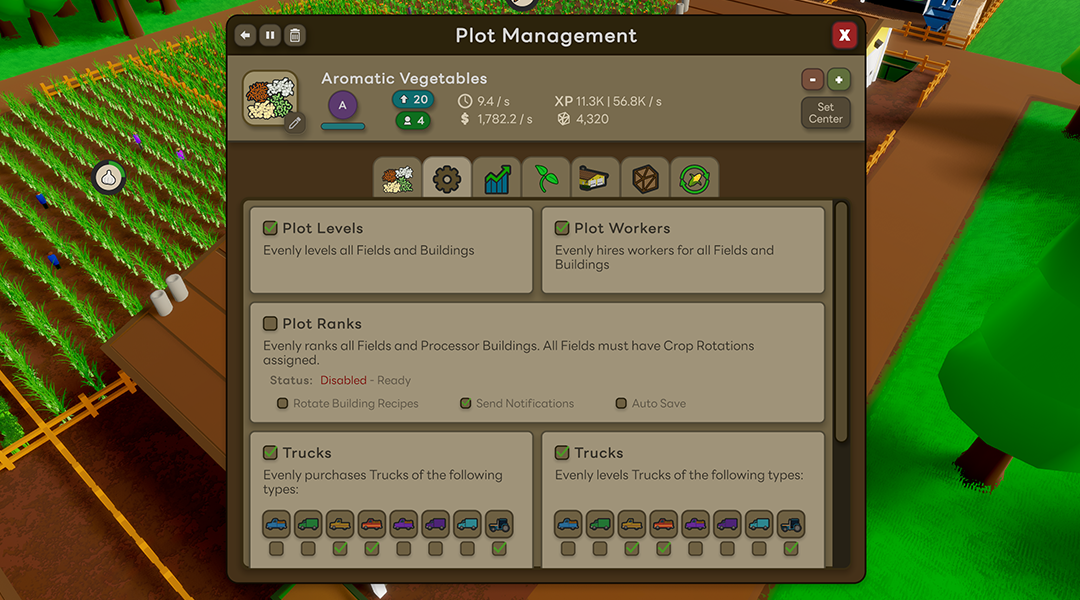 Once you've made a Management Group, you can also enable certain automatic upgrades for that group. These options will initially allow the group to automatically purchase Plot Level and Worker upgrades, and you can unlock other options for Trucks and Truck Levels. Similar to the existing upgrade purchase buttons when you have multiple plots selected, this system will purchase upgrades all at once in order to maintain even upgrades across all the plots in the group.