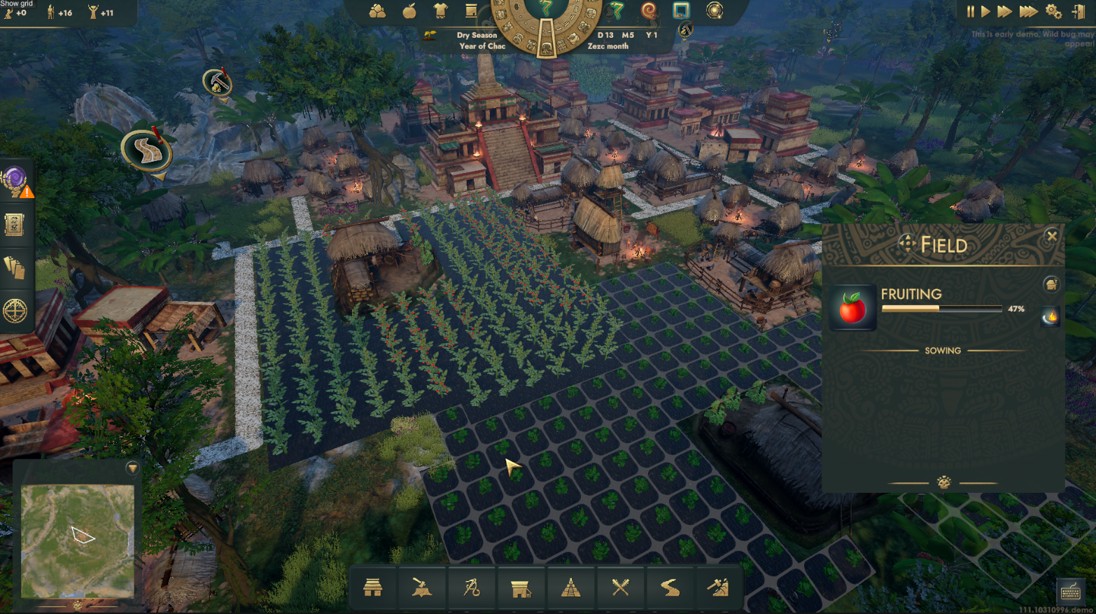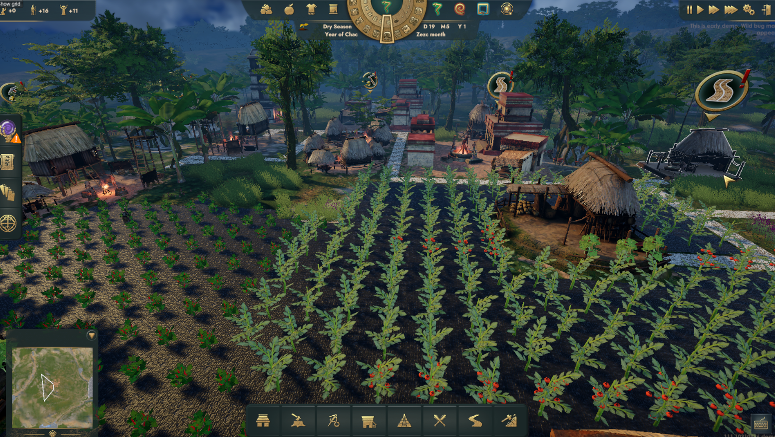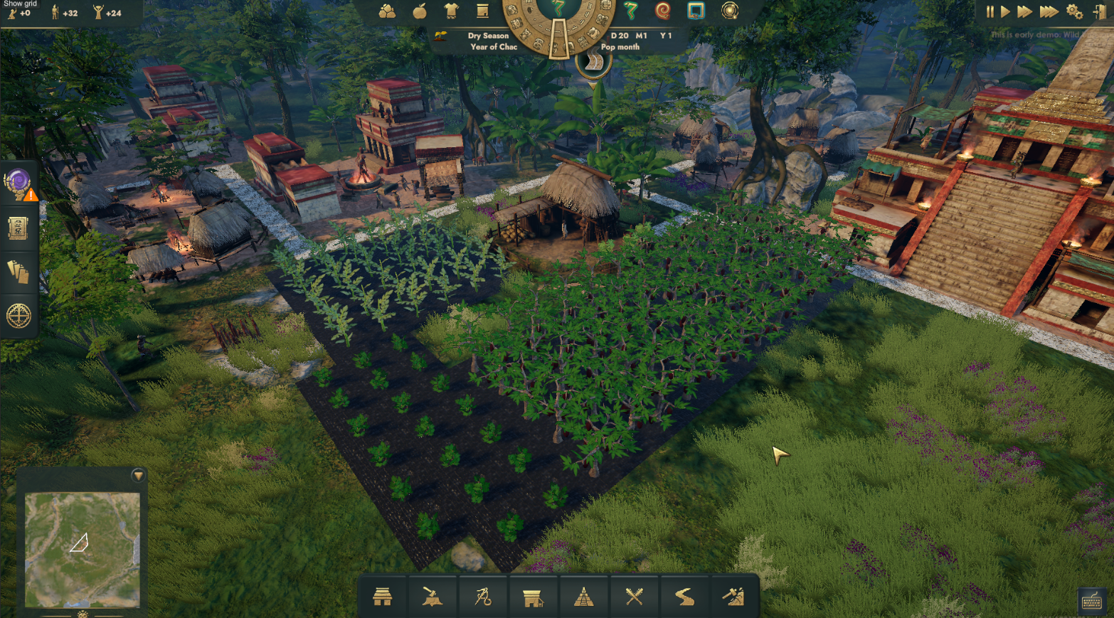 Before any kind of plants can be sown, the ground needs to be prepared. Once this step is taken care of, you can start cultivating your first veggies! 🤩 One of the key parts of your citizens everyday diet is corn. One of the multiple purposes you can use it for is to make corn flour and turn it into a beautiful, tasty cornbread. 🍞 To diversify your diet you may consider planting some beans or tomatoes which can later become a mouth-watering stew. 🤤