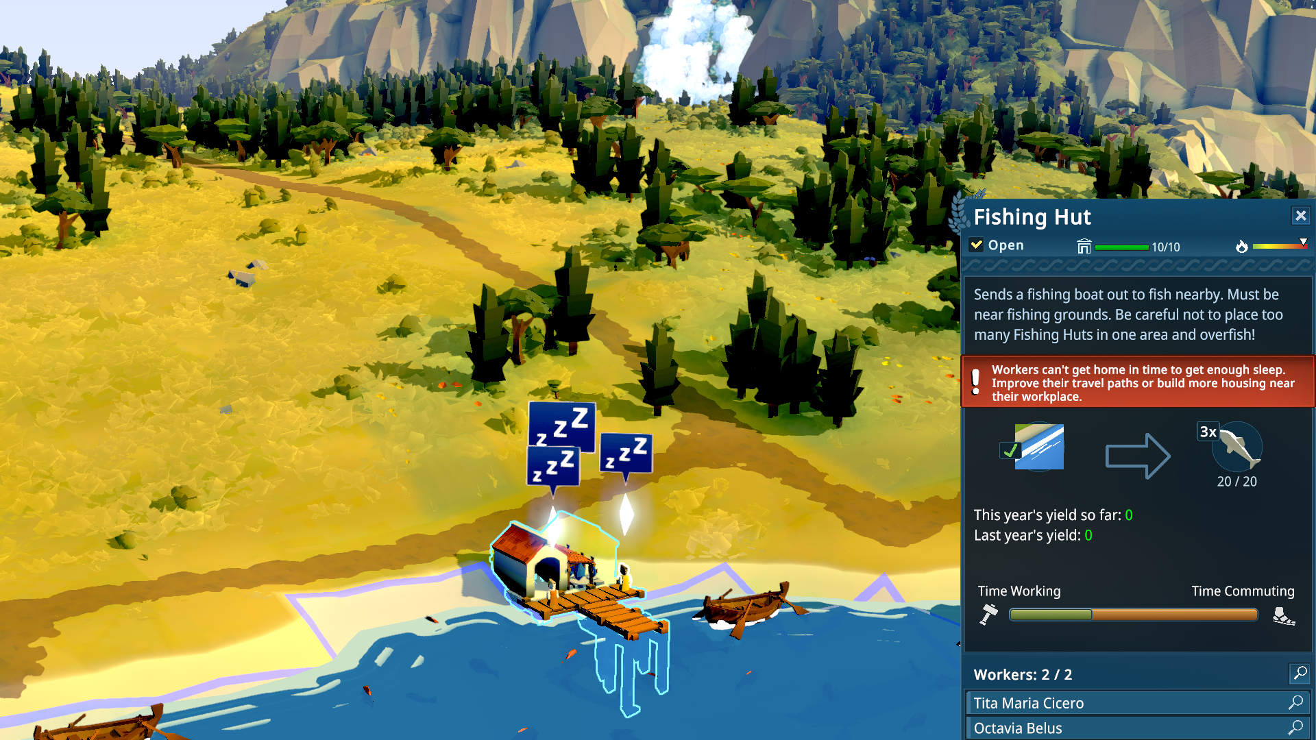 If they spend too long walking to work, the productivity at that building will suffer. You can see this split on the 'Time Working' vs 'Time Commuting' bar in the UI. Here we can see workers are spending the great majority of their time walking to work instead of actually fishing. This is an important tool to diagnose production issues in your city, and of course the building itself will notify you of an issue using the thought bubble system: