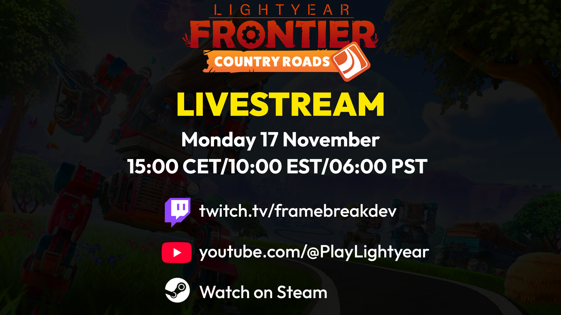 As part of the launch for Country Roads, we're gonna be broadcasting all the new stuff from the update! Join us on Monday 17 november at 15:00 CET/10:00 EST/06:00 PST to see new stuff, ask questions, and generally hang out! The stream will be available on Steam, Twitch, and Youtube.