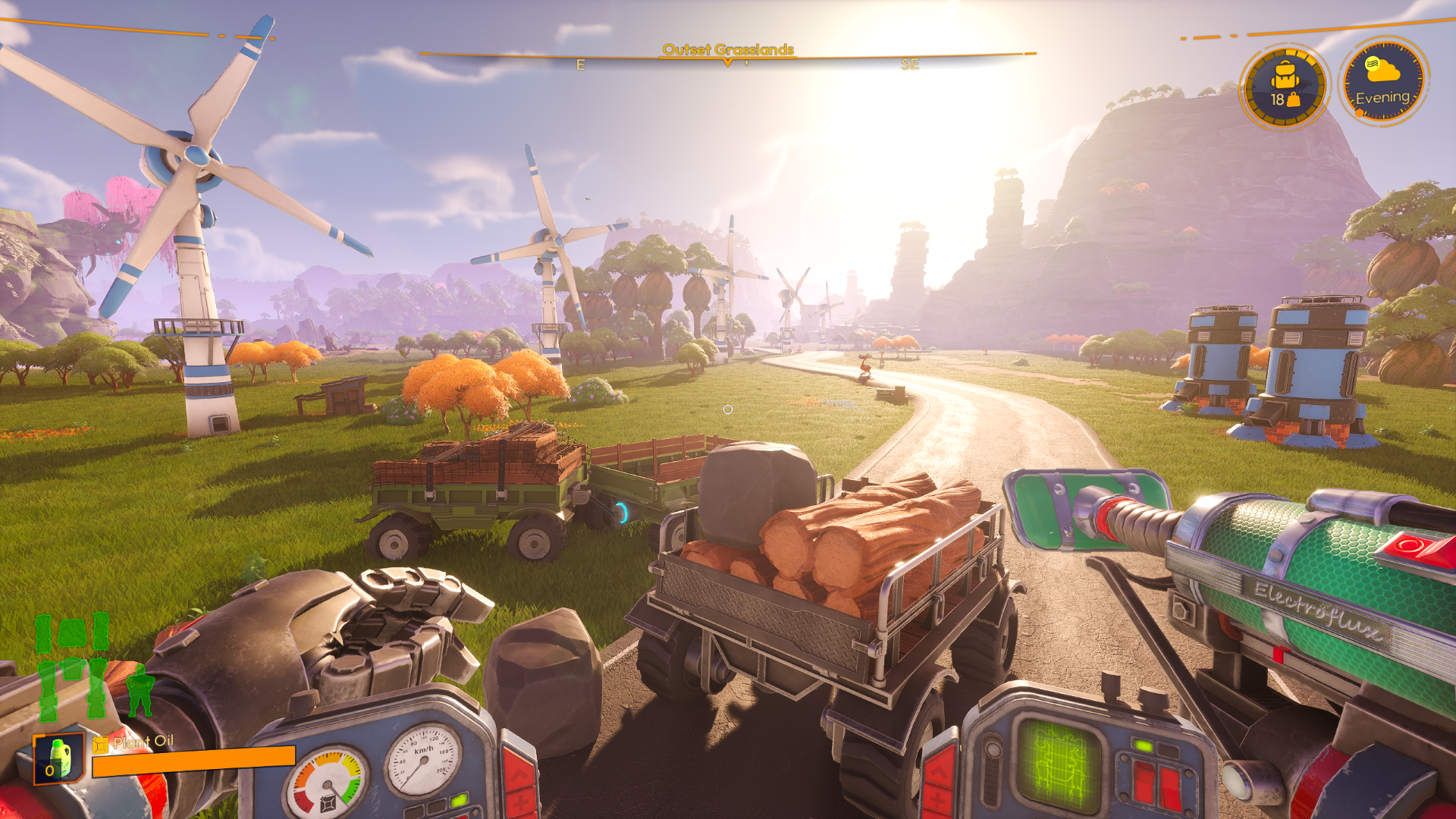 Country Roads is all about evolving how you gather, transport, and process resources. It improves the hands-on, powerful feeling of the mech and creates new infrastructure projects to take on, where you can put in time and resources to make your farming and crafting life more convenient and productive.