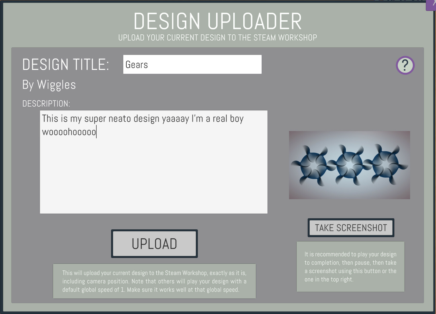 1. The screenshot that gets uploaded with your design is the most recent one you've taken. So play your creation to completion, pause, then take a screenshot using the in-game screenshot button. It does not look at your Steam screenshots! Mostly because I don't want people accidentally uploading shots from other games as their thumbnail.
