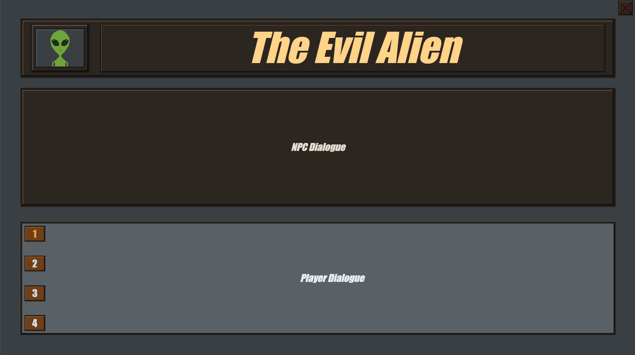 I am 17 days away from the next version of my demo, and to be honest the new dialogue system has been quite difficult for me to implement. I am going from a linear dialogue system where you press a button and boom there's is the next line to now you have options and free will, similar to an RPG. And just getting the technical side of it up and running has been a pain but I am pretty sure I will have the hub dialogue with the evil alien completed by the time the next demo version is set to release. Here is a sneak peak of the new interface for it, See you November 20th!