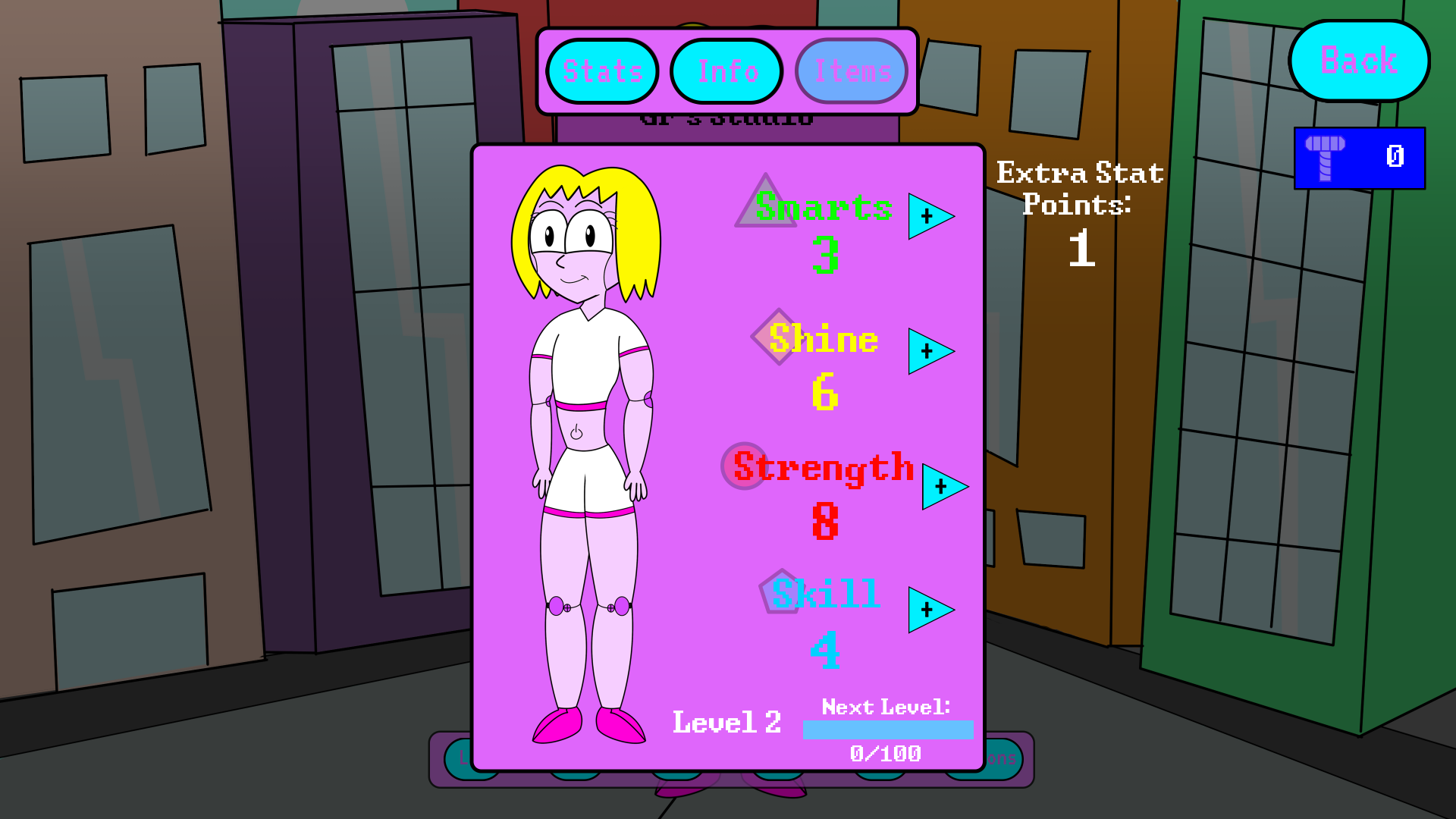 Second, here's a general preview of what you can expect from the next update. After some further testing, I feel that the current mechanics of the game don't provide the player with enough motivation to keep playing. To address this I am implementing a simple RPG leveling system. Every time the player performs an action, they'll receive experience points. They'll get more points for a successful action and less for a failure, but they'll earn points regardless. For every 100 points the player earns they receive an extra stat point to apply to one stat of their choice. Below is a new screenshot showing the stat menu after a level up.