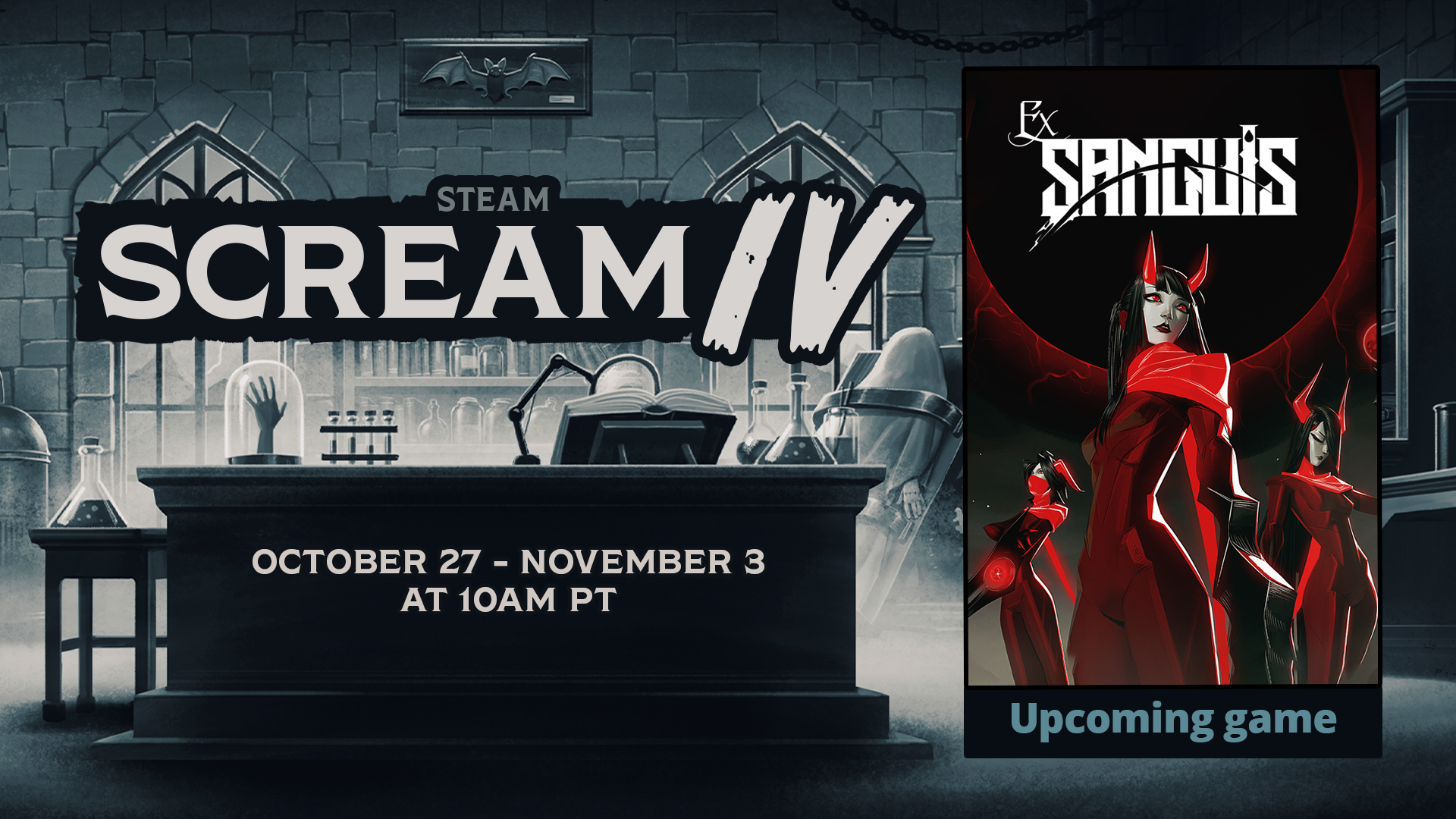 For Halloween, we have a brand new playtest! We're participating in the Steam Scream Fest starting on Monday 27th of October. Join us and discover the world of Ex Sanguis, its universe and what populates it.