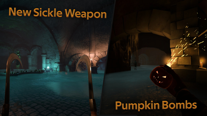 There are some new Halloween-themed weapons as well, including a Sickle and Pumpkin Cluster Bomb! You can purchase these from the Vendors (check back often, they aren't always available!)