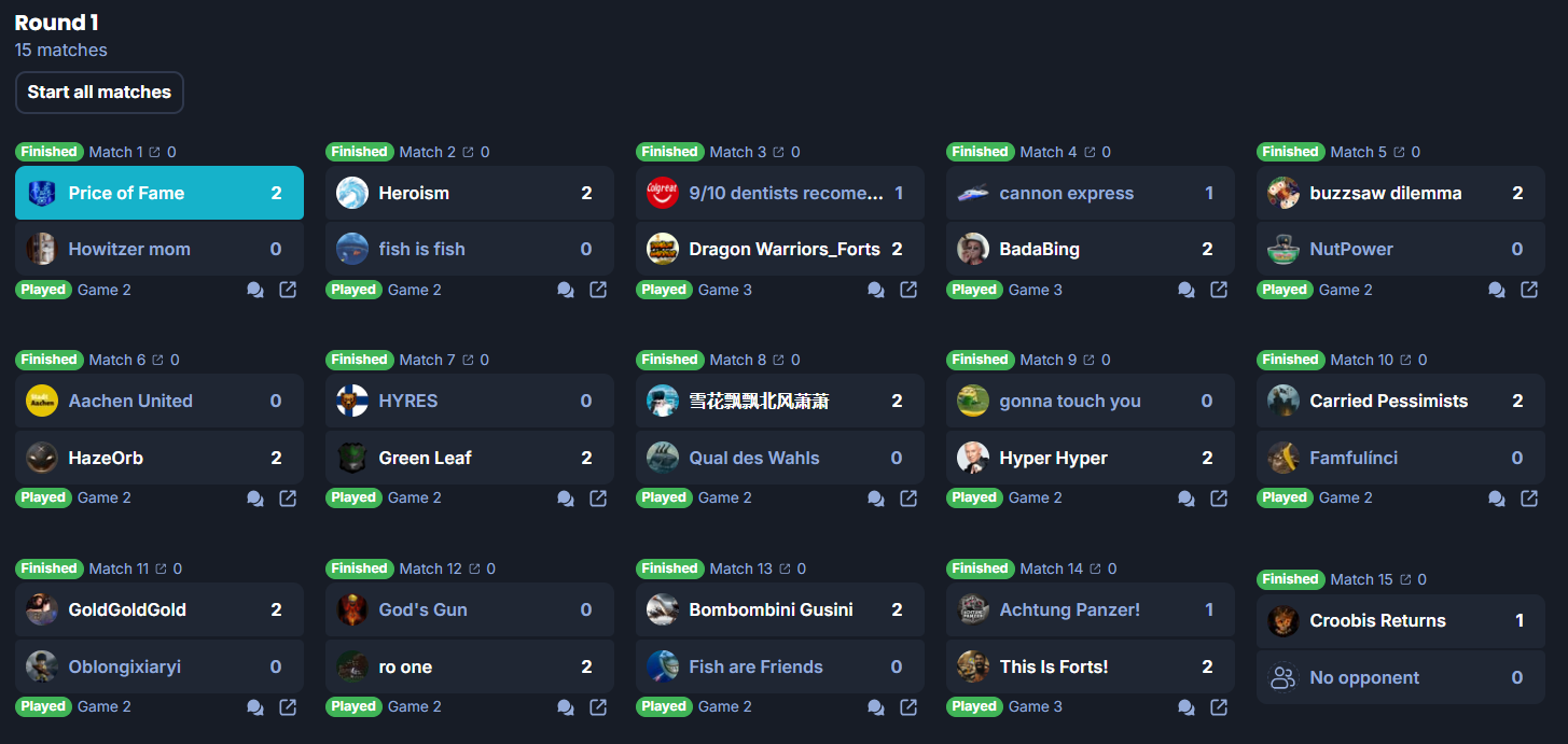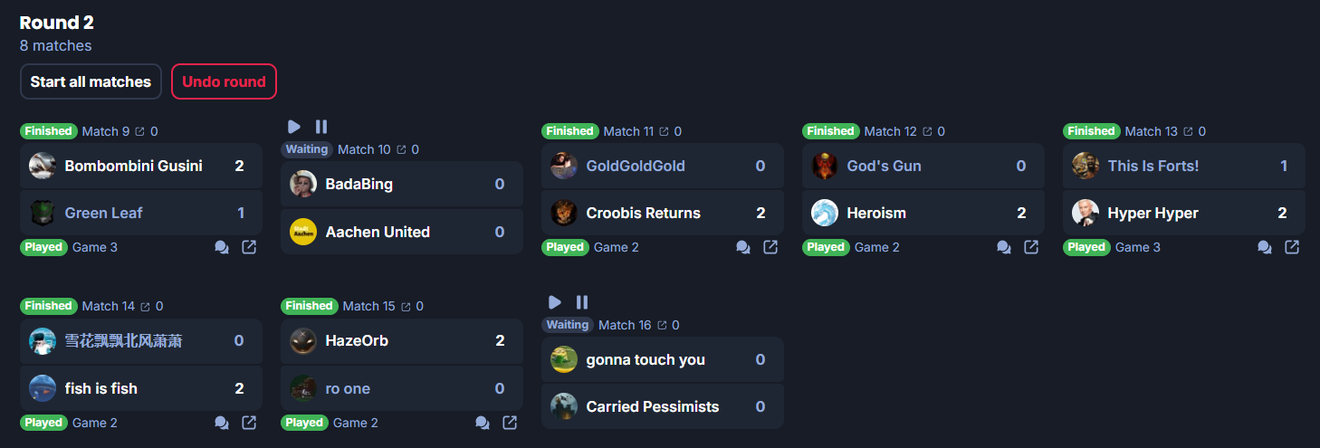 As a reminder, this season uses the swiss bracket format: teams fight each other and are seeded depending on how many wins/losses they have so far.
