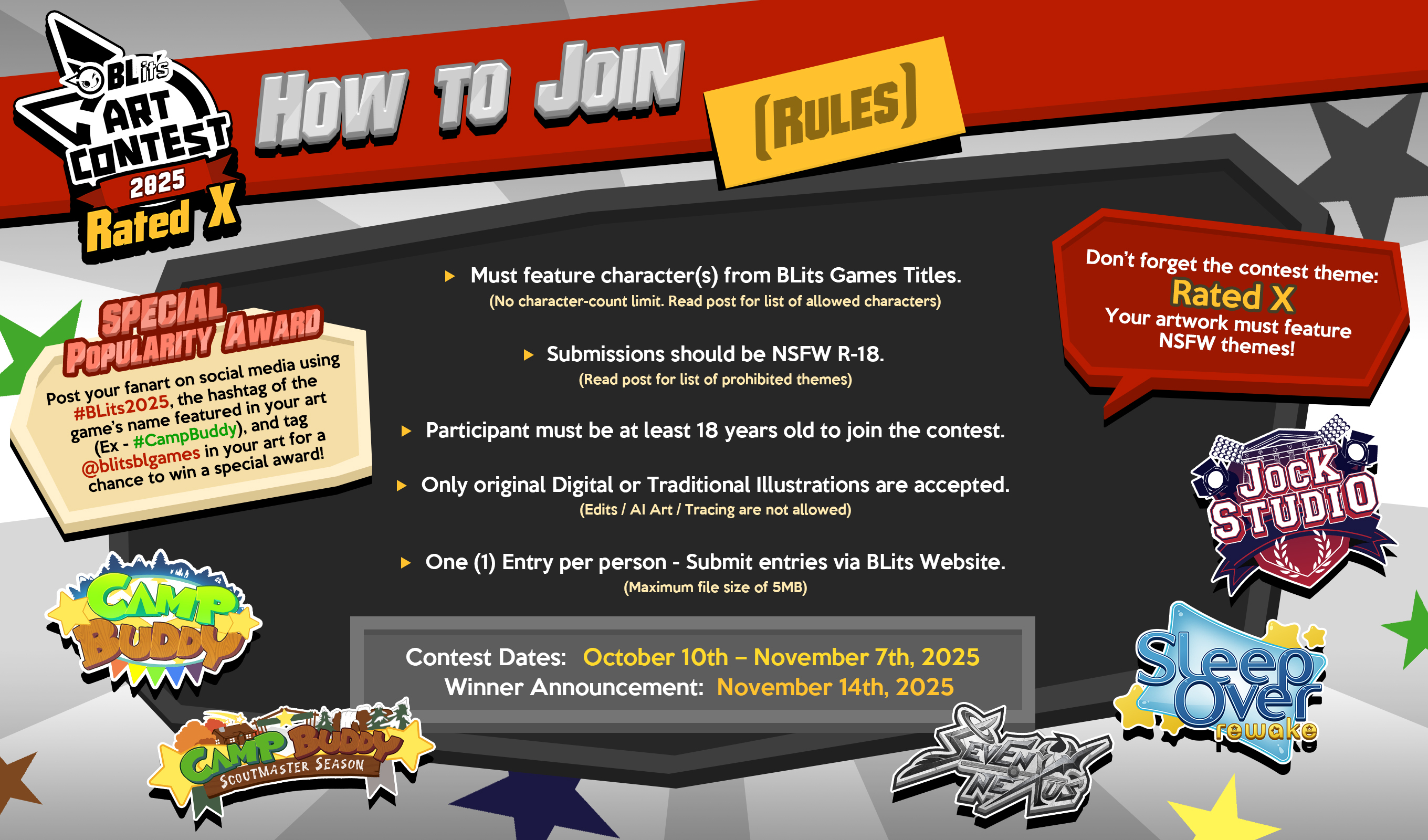 Finally, we’ll have five Honorable Mention winners, one for each of the various BLits Games titles – Camp Buddy, Scoutmaster Season, Jock Studio, Seven Nexus, and Sleepover: reWake! Outside of the other winners, the BLits Team will choose five artworks that we feel best represent these respective titles and the theme and grant them the Honorable Mention award!