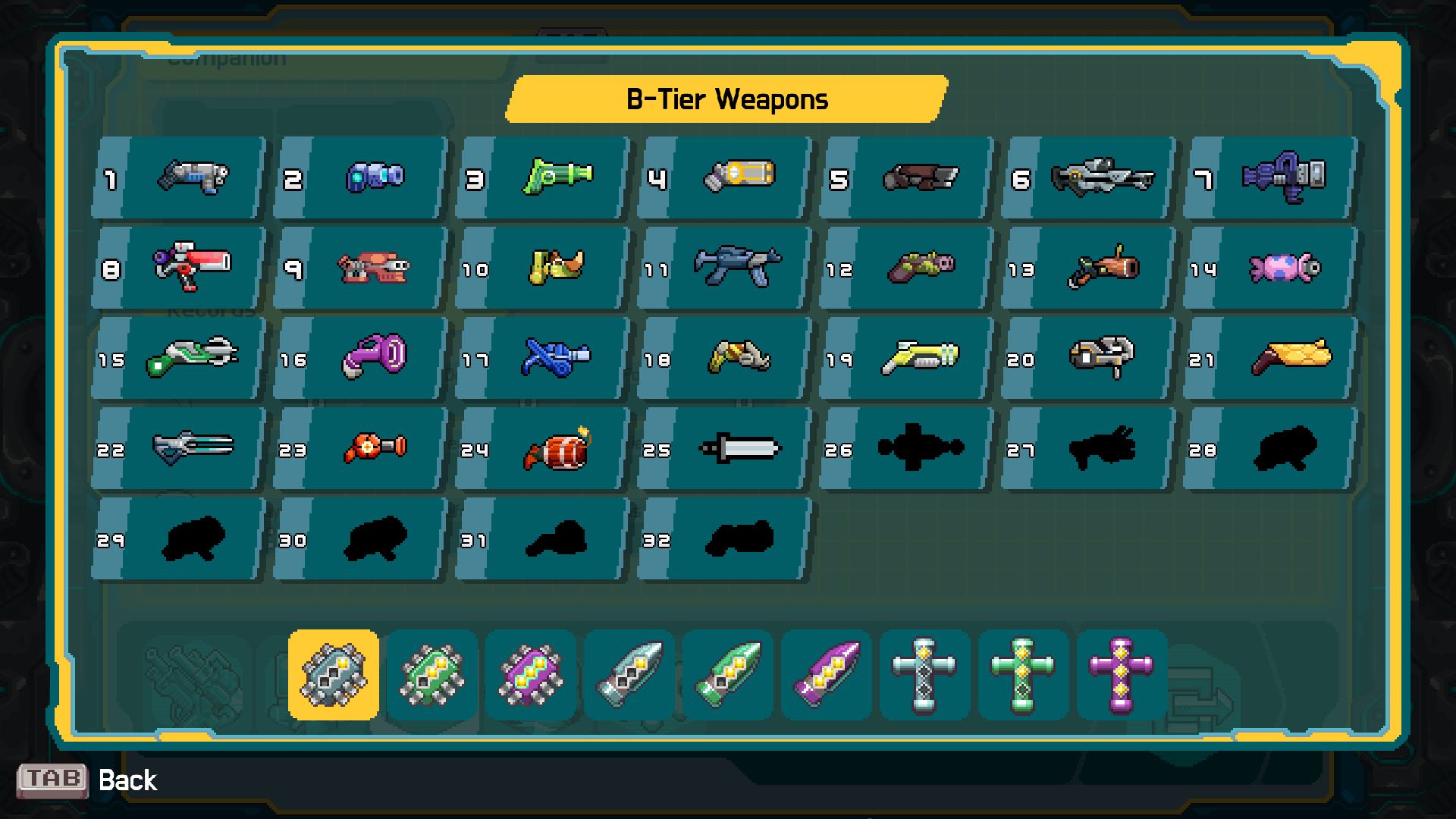 In Critadel, there are number of different weapons to discover. Each weapon has a letter rank, either B, A or S. As you may have guessed, S-rank weapons will be better than weapons in the A group, and A is better than B. Each weapon is also very unique, and we're certain that you'll have a lot of fun playing around with them. Here are some examples of the weapons you will find in the game.