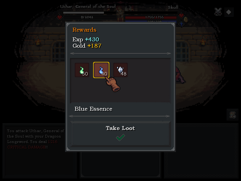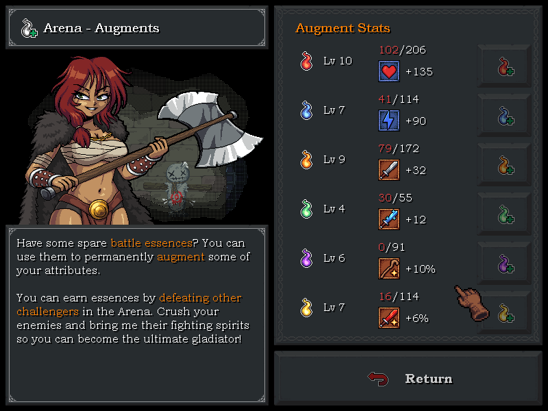 - Essences obtained from defeated enemies can be exchanged for permanent incremental upgrades to some of your attributes;