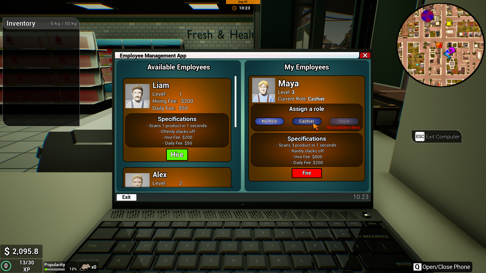 After hiring your employees, you need to assign a role to them via the "My Employees" application on the market laptop. If you don't assign a role to your employees, they will be drinking coffee or smoking in the back.