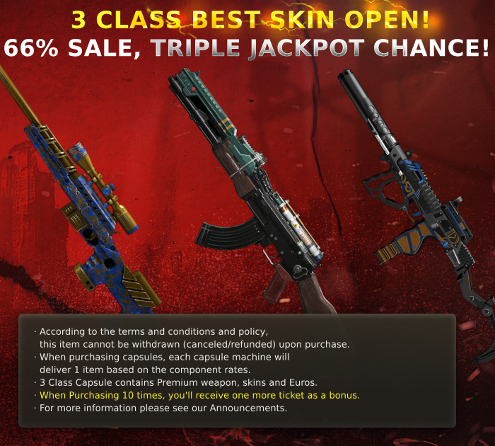 Please note that: You can have a chance to obtain Bahamut the Galaxy, Desmodus Krv, Verserk Fast Blue, Raven NTS, MA-47 Volt, MA-47 Mammon, X4A1 Bumblebee, X4-Pro Supremacy, EPKO Sevres, V Nagant Steel Dragoon, G93 Dark Matter, Ballista Primavera skins. The Capsule contains Premium, and in-game Euros.