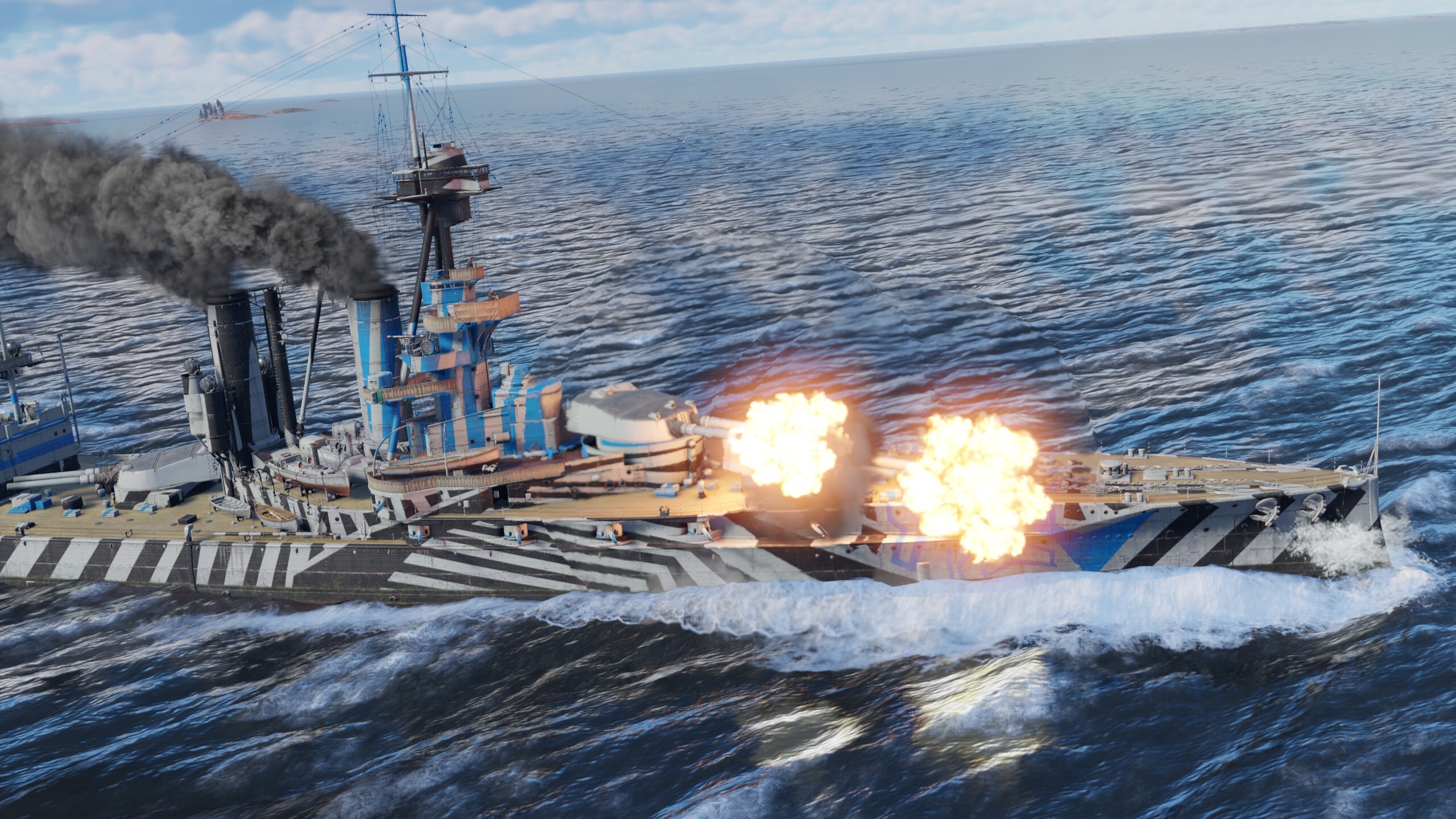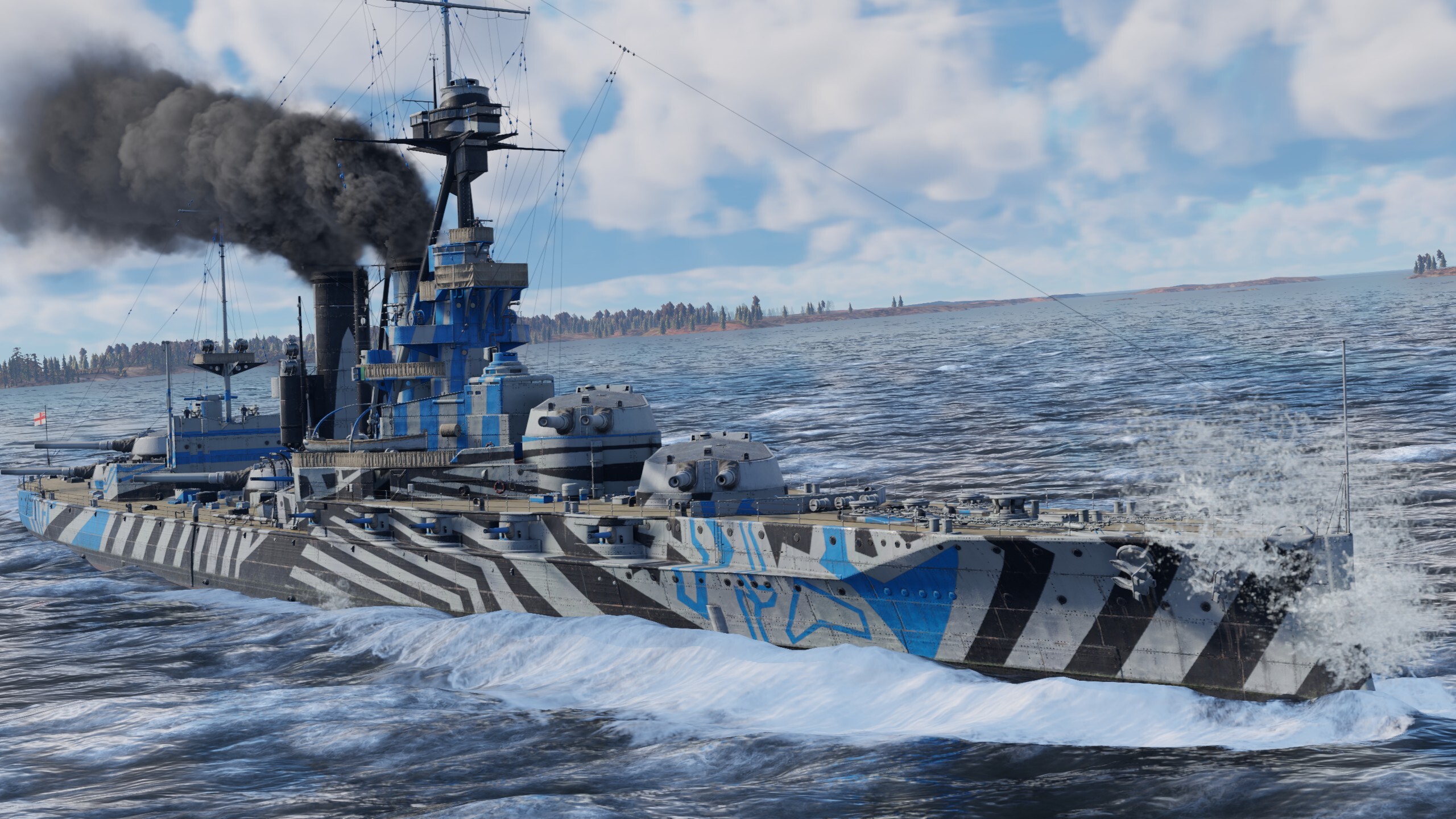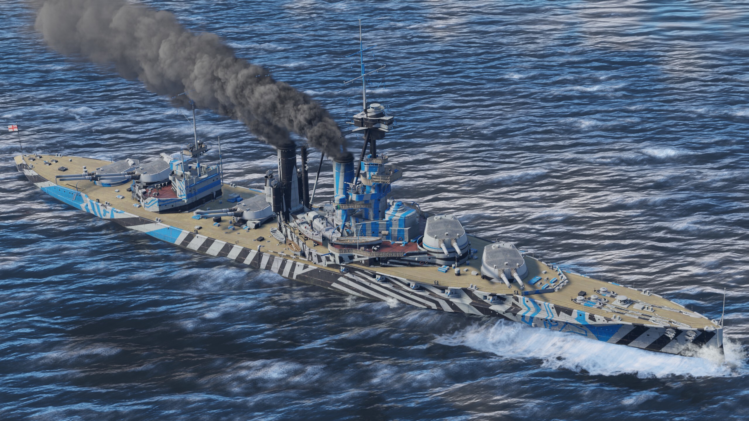 HMS Iron Duke features excellent protection and devastating firepower! Ten 343 mm main guns and twelve 152 mm secondary guns are ready to riddle anyone who challenges this super dreadnought. When playing this battleship, stick close to allies that have strong anti-air defenses, engage slower larger targets and strike with no fear!