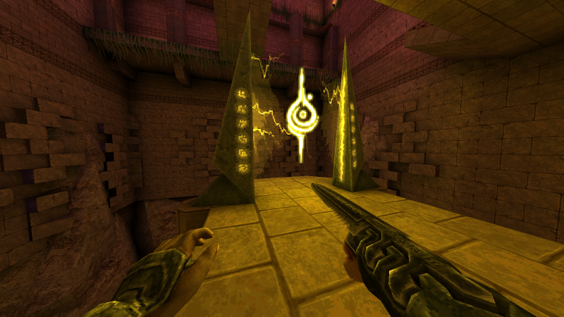 First up, we’re gonna show you some terrain for E2M1, the first map of episode 2. As part of the detailing for the map, we have these giant crystalline structures – which are both part of the look and feel of the map, but will also serve as the apparent origins of the local creatures. And rumor has it that someone even fashioned instruments of war from these powerful crystals...
